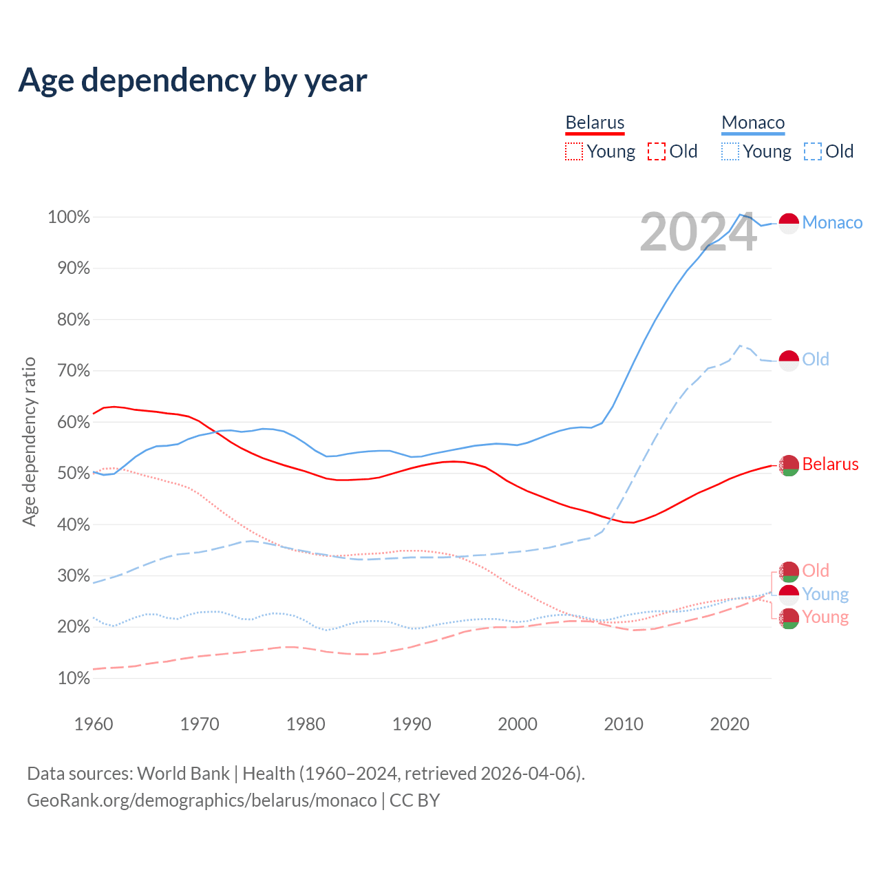 - Belarus is ranked 35/196 by median age (oldest to youngest) vs 1/196 for Monaco.