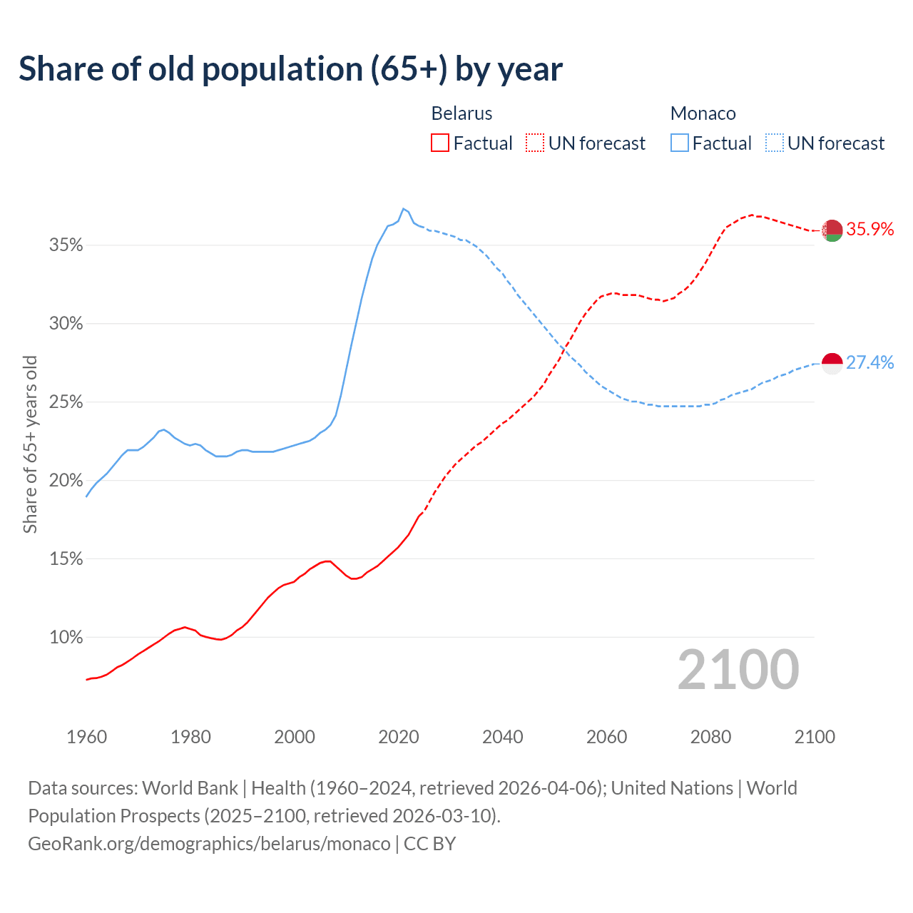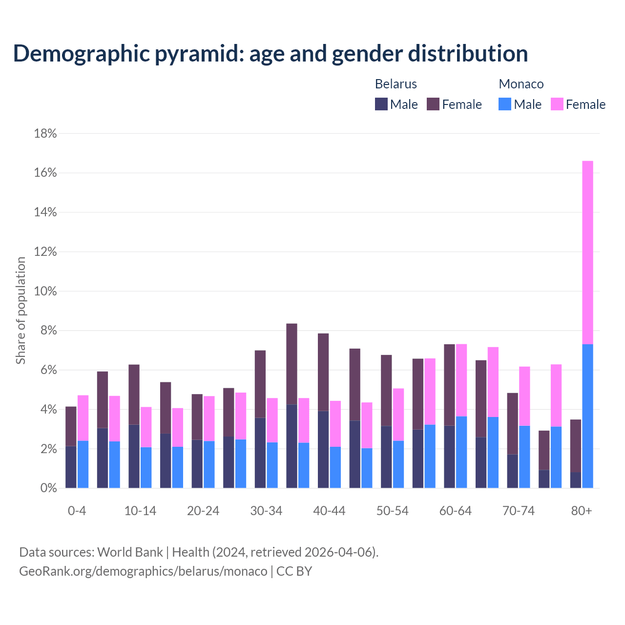 The share of older people aged 65 and over is 17.7% in Belarus and 36.2% in Monaco. Life expectancy in Belarus compared to Monaco .