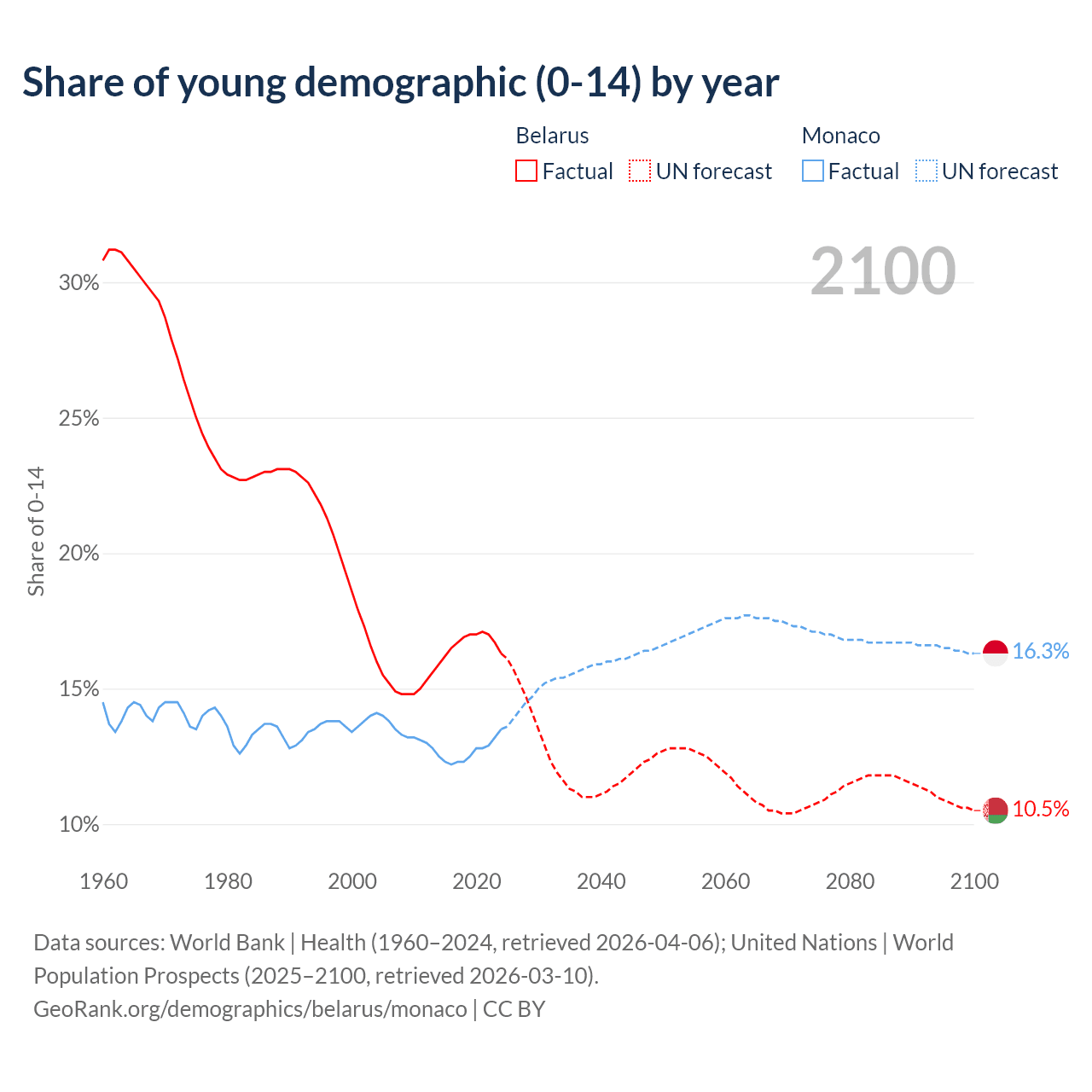 - The share of young demographic (0-15 years old) in Belarus is 16.3% vs 13.5% in Monaco.
