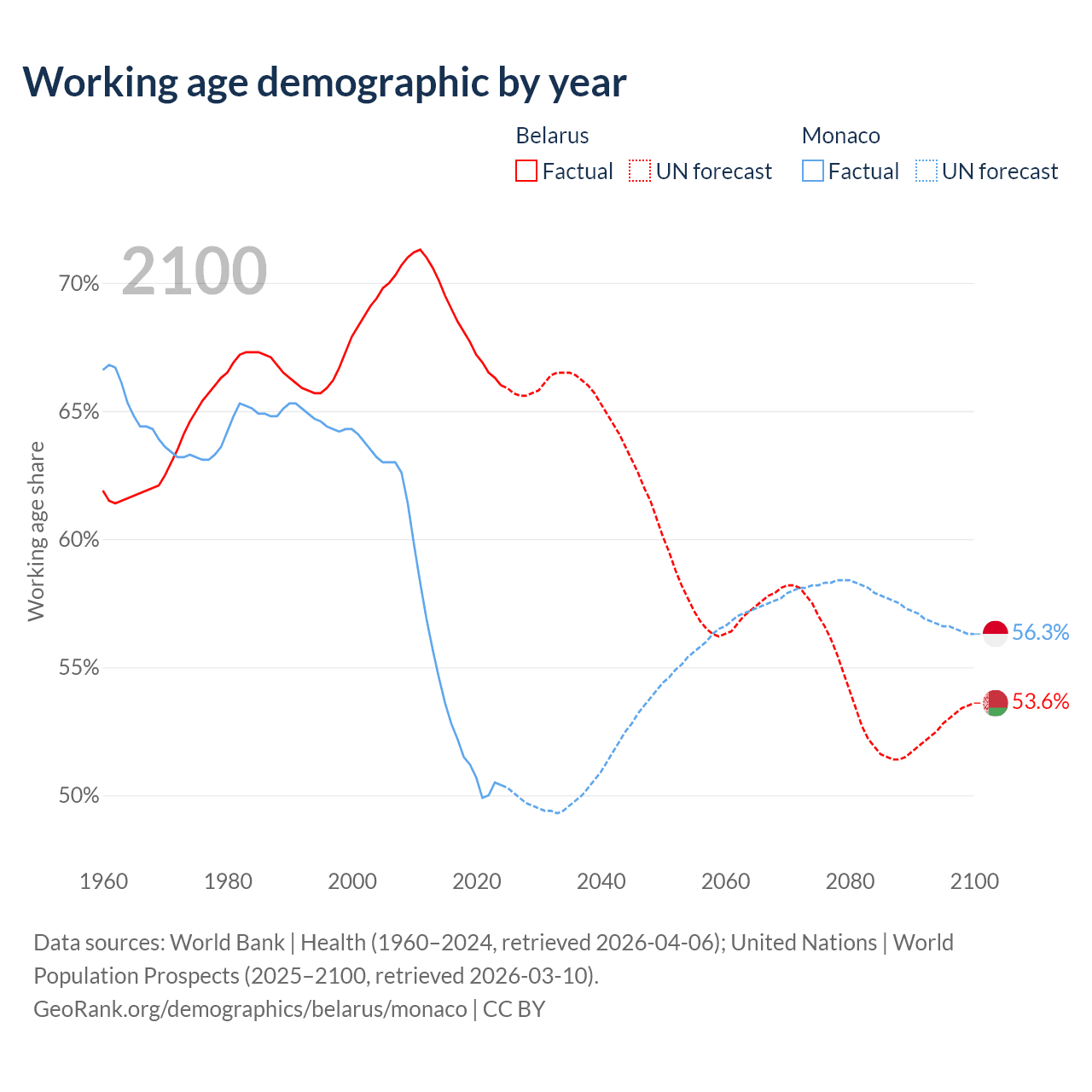 - Belarus has 5.95M working age adults (aged 15-64) vs 19.2K in Monaco.