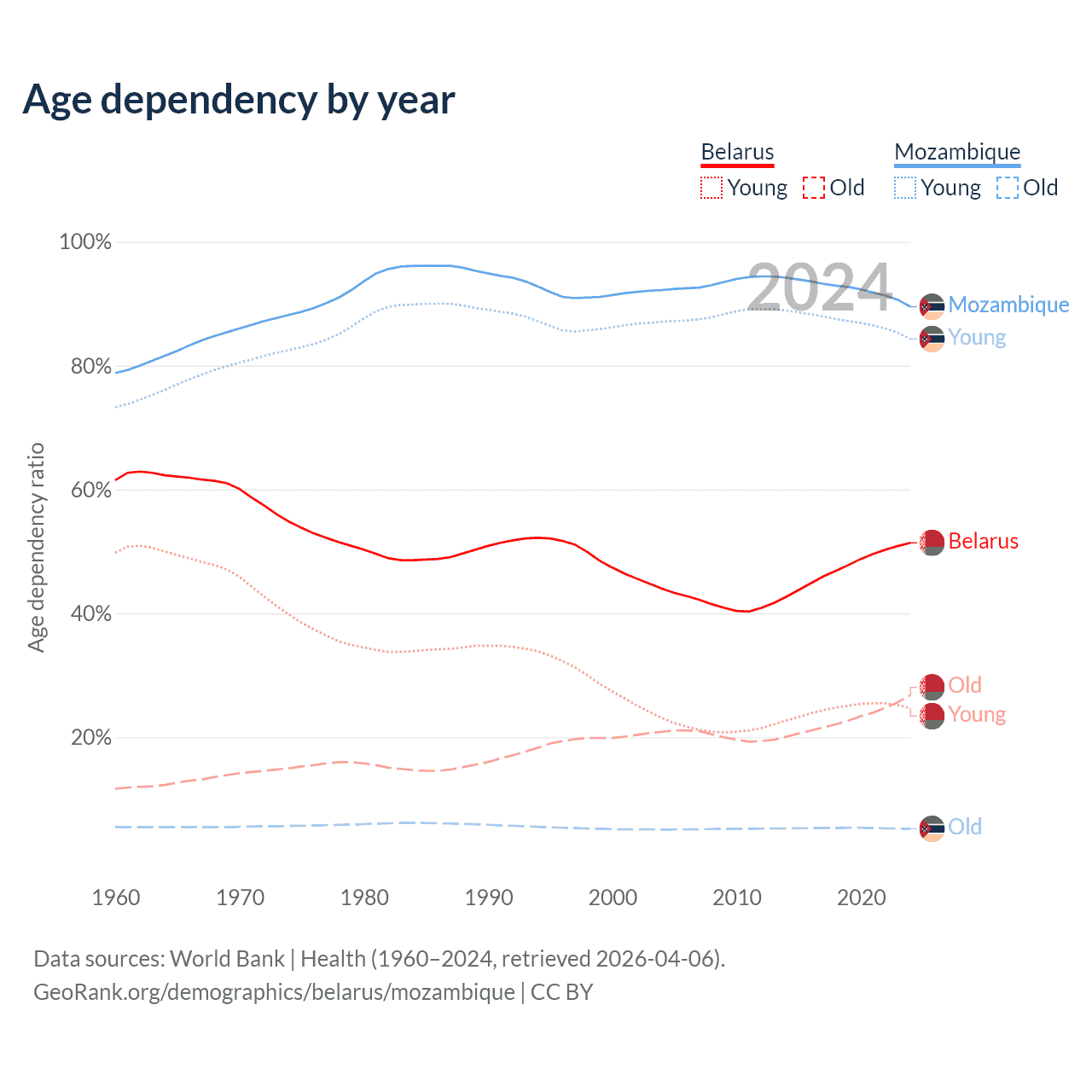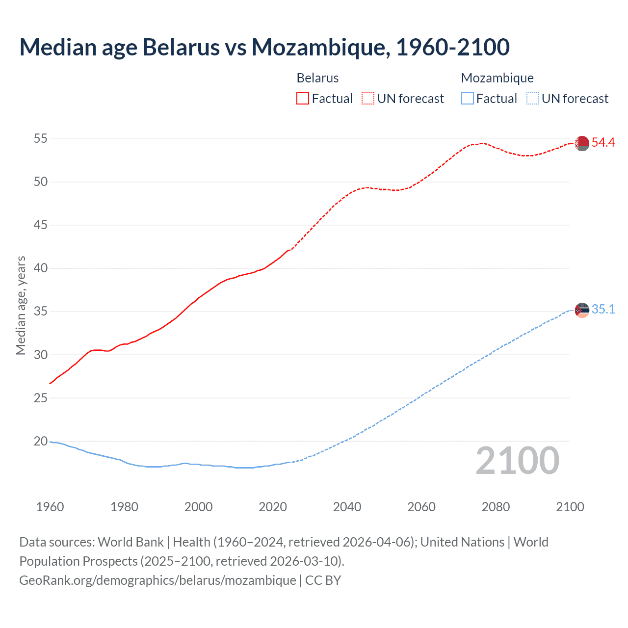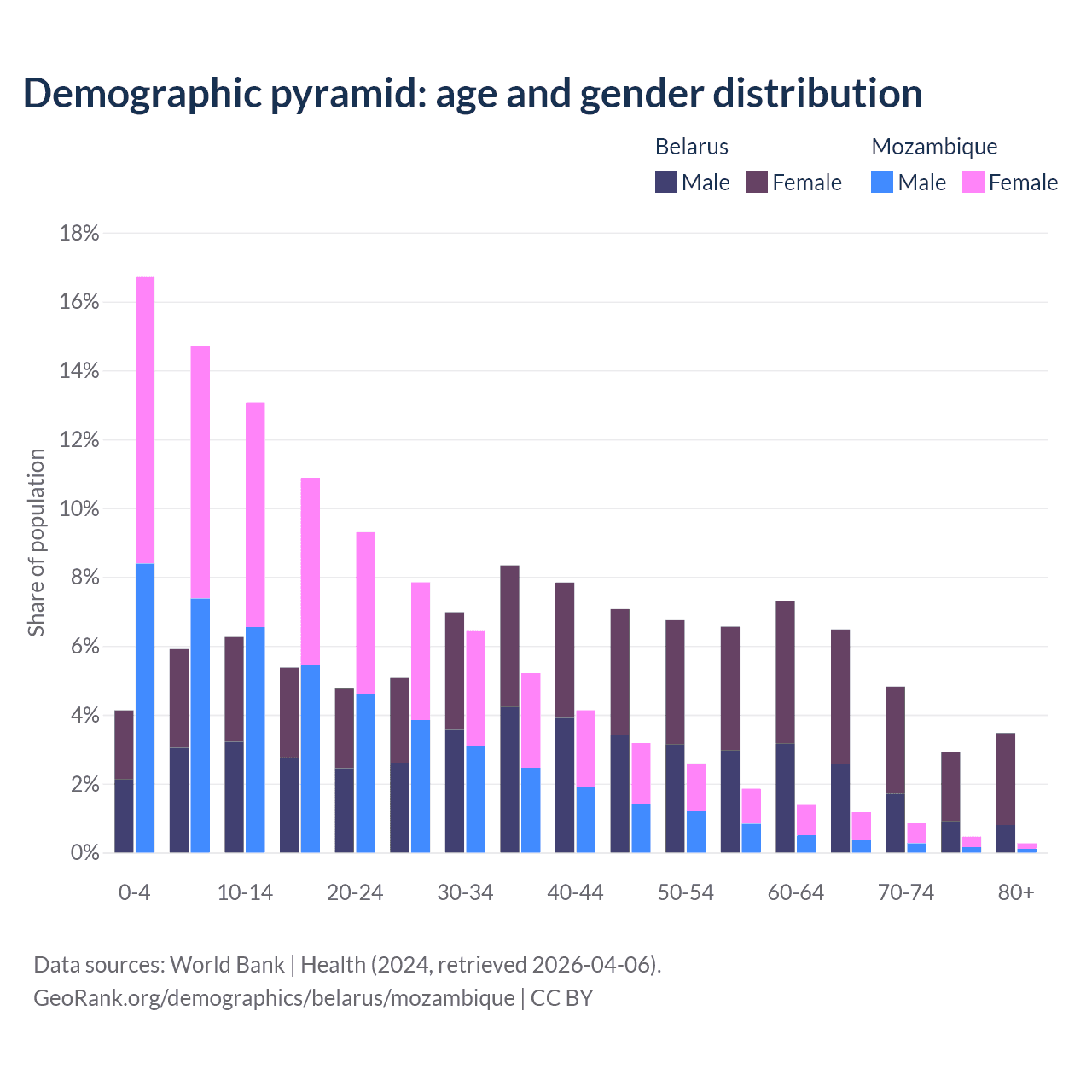 - Belarus is ranked 35/196 by median age (oldest to youngest) vs 189/196 for Mozambique.
