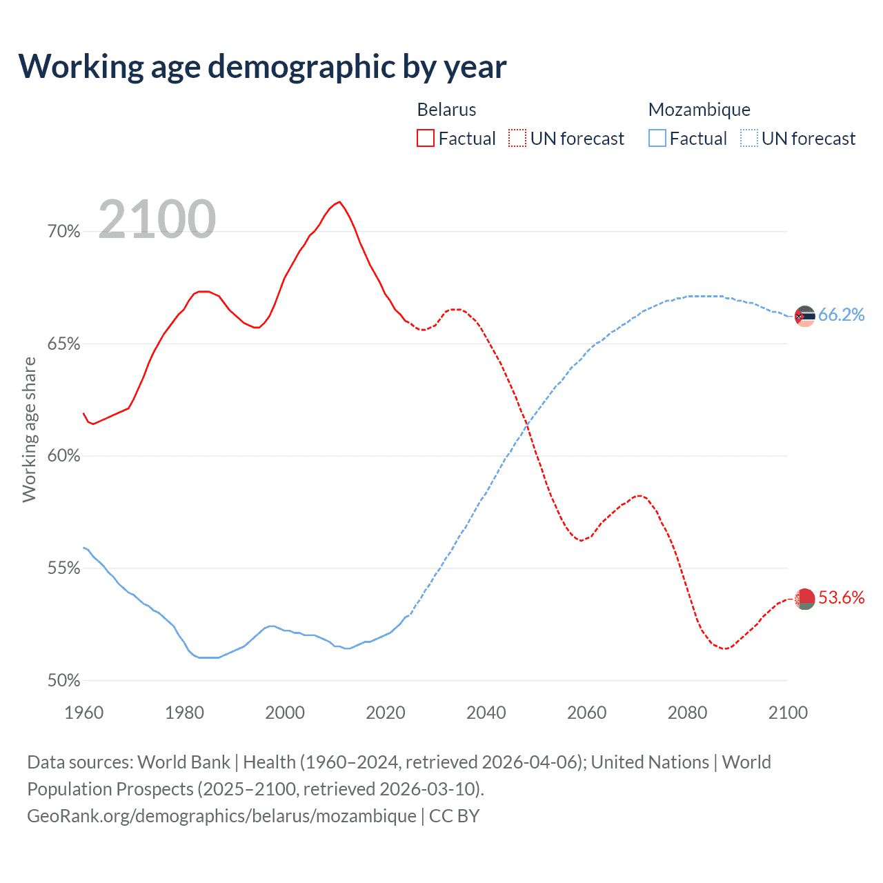 - Belarus has 5.95M working age adults (aged 15-64) vs 19.5M in Mozambique.