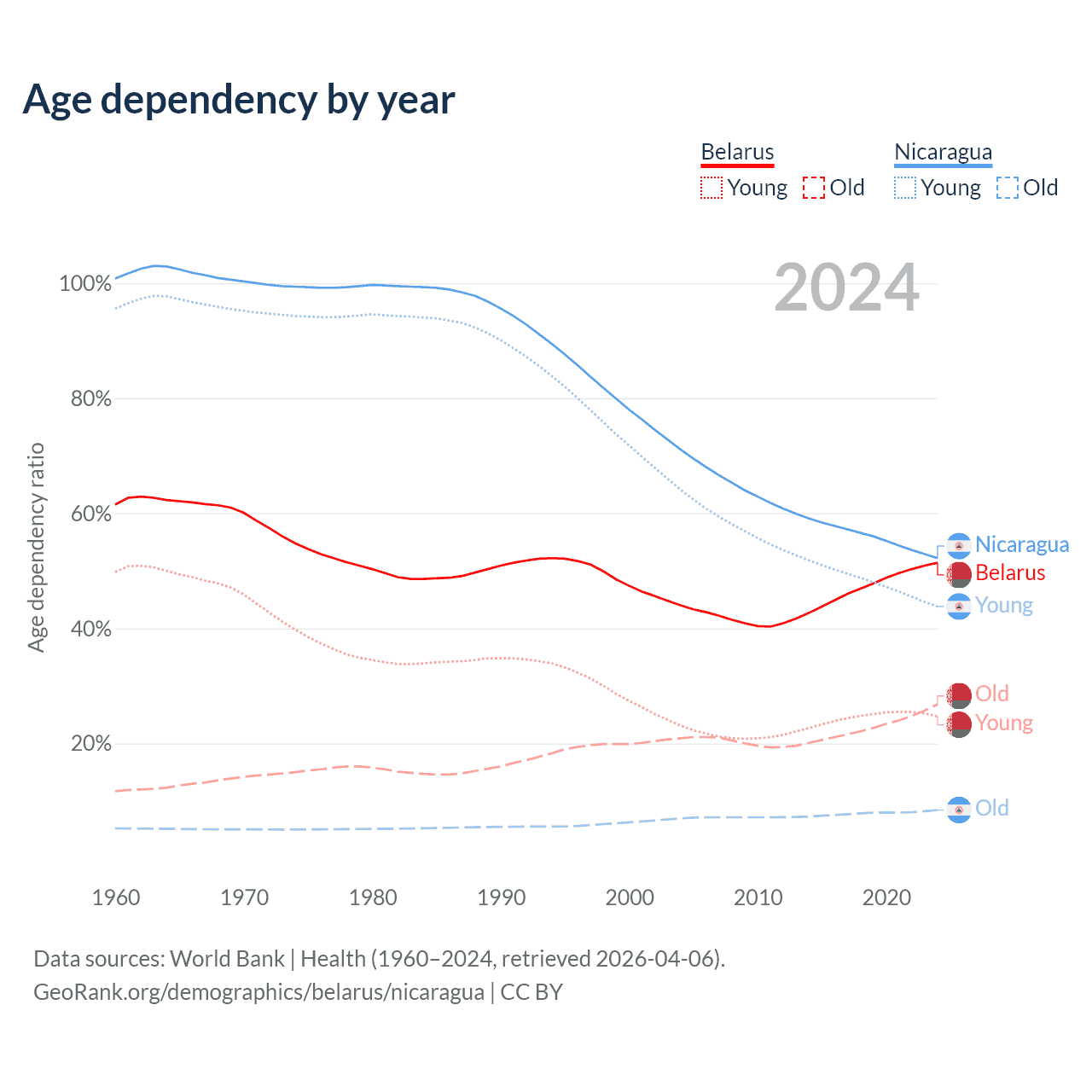 - The share of old-age demographic (65+) in Belarus is 17.7% vs 5.53% in Nicaragua.