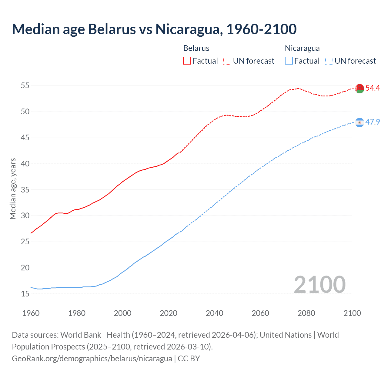 Median age Belarus vs Nicaragua, 1960-2100