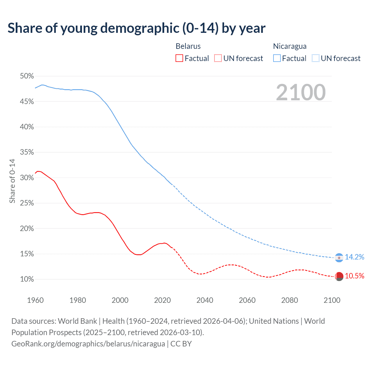 - The share of young demographic (0-15 years old) in Belarus is 16.3% vs 28.8% in Nicaragua.