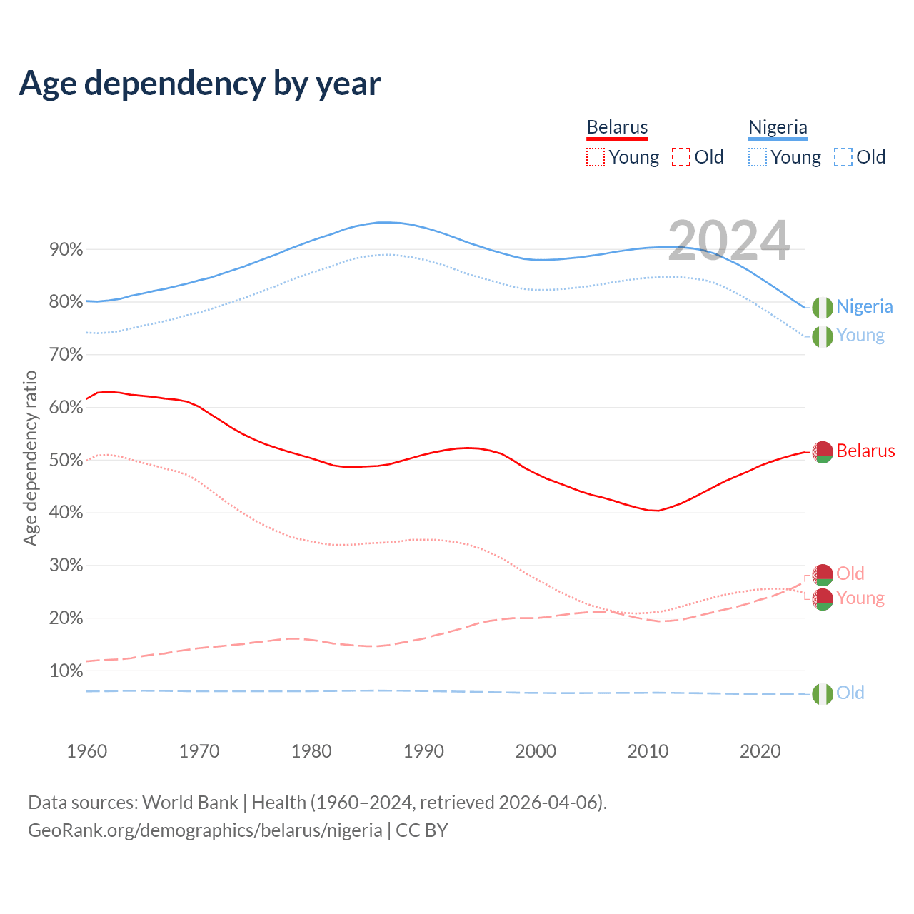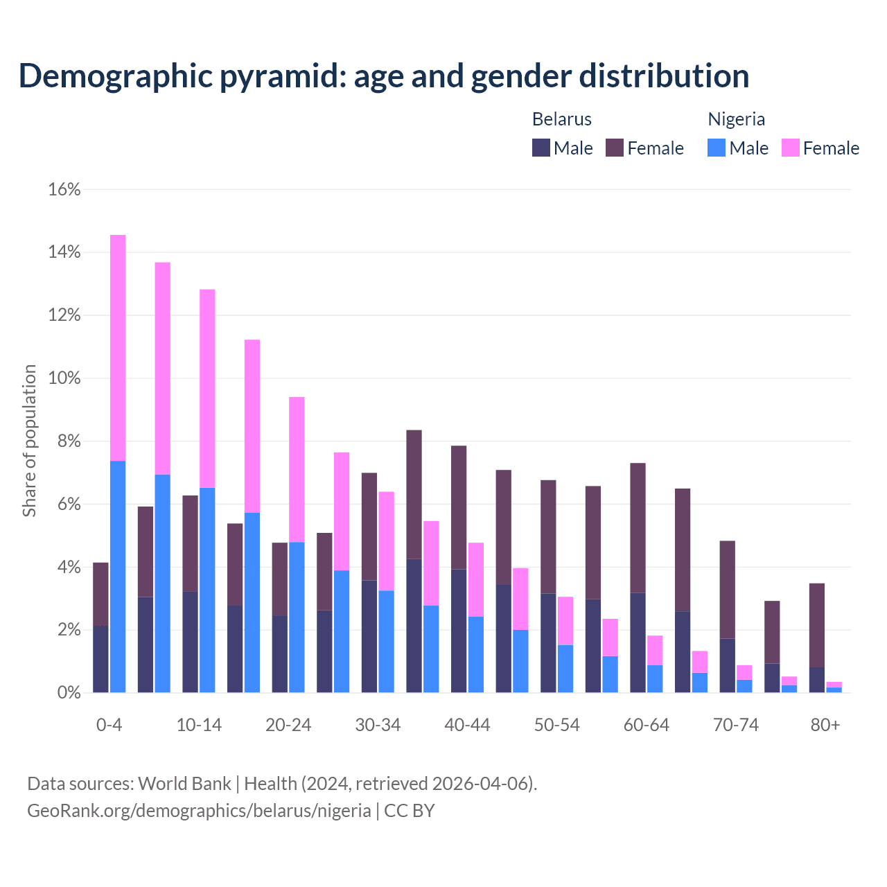 - Belarus is ranked 35/196 by median age (oldest to youngest) vs 178/196 for Nigeria.