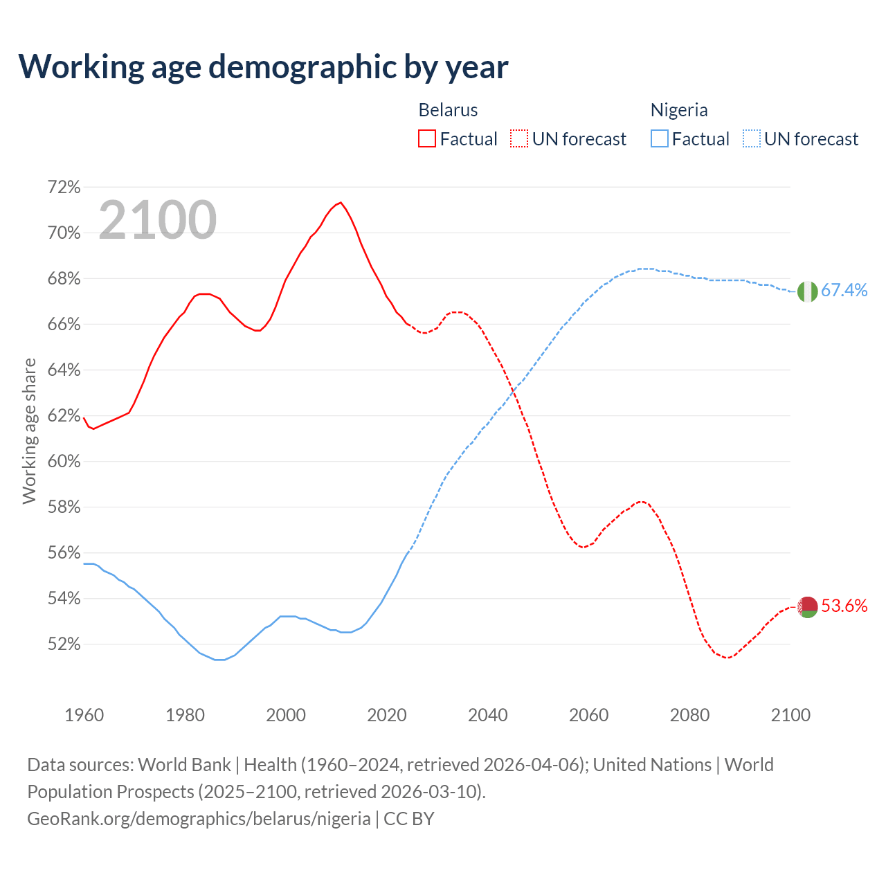 - Belarus has 5.95M working age adults (aged 15-64) vs 136M in Nigeria.