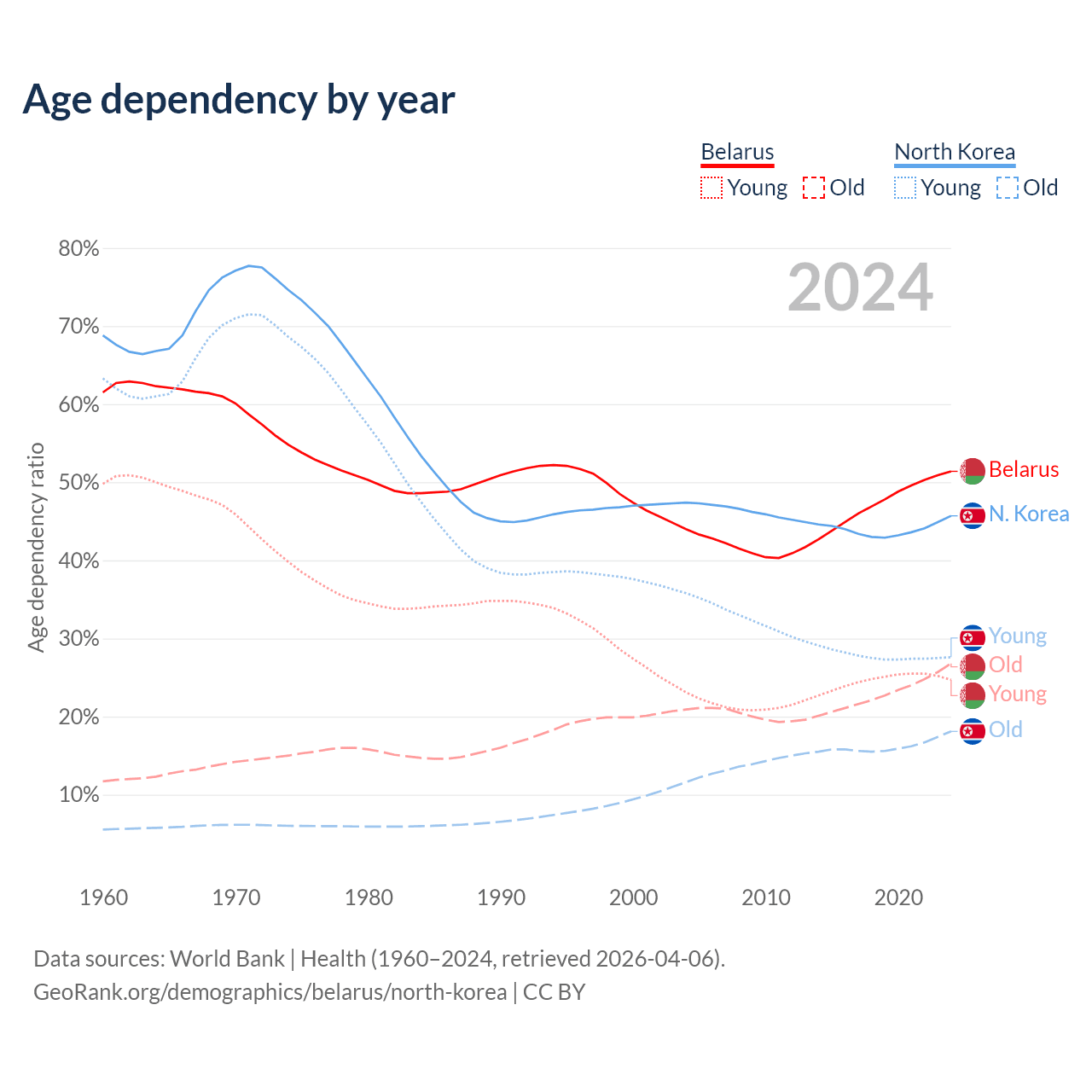 - The share of old-age demographic (65+) in Belarus is 17.7% vs 12.4% in North Korea.