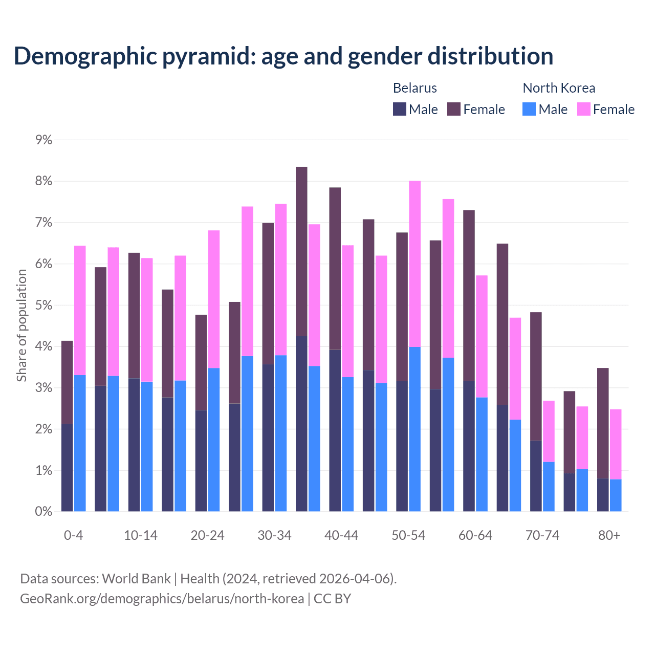 The share of older people aged 65 and over is 17.7% in Belarus and 12.4% in North Korea. Life expectancy in Belarus compared to North Korea .