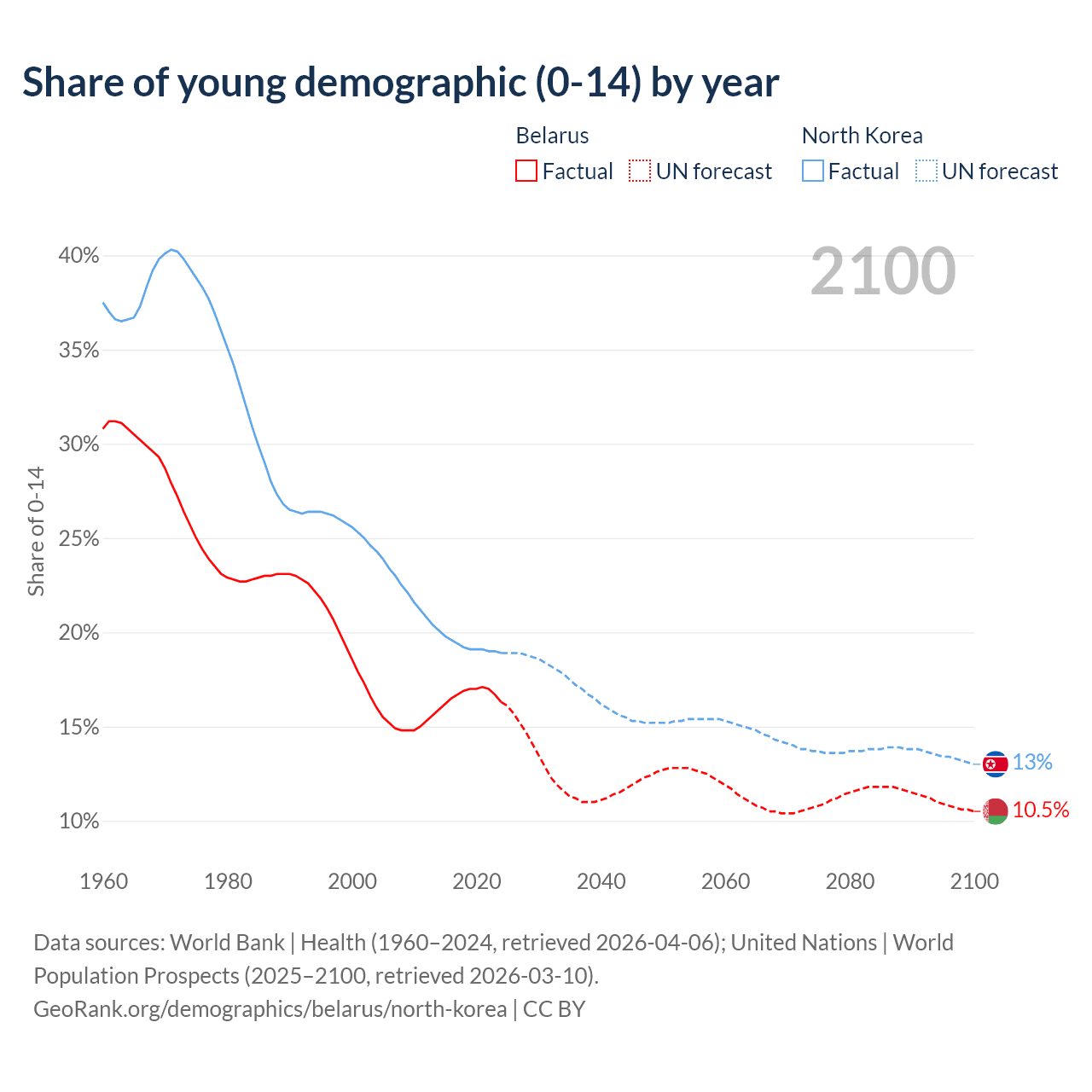 - The share of young demographic (0-15 years old) in Belarus is 16.3% vs 18.9% in North Korea.