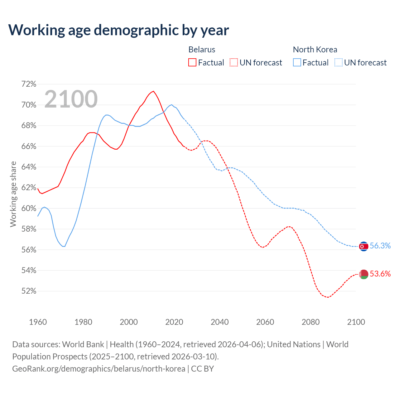 - Belarus has 5.95M working age adults (aged 15-64) vs 18.3M in North Korea.