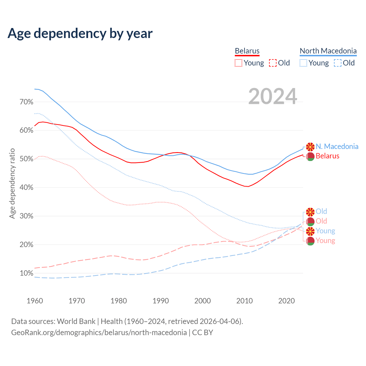 The share of older people aged 65 and over is 17.7% in Belarus and 18% in North Macedonia. Life expectancy in Belarus compared to North Macedonia .