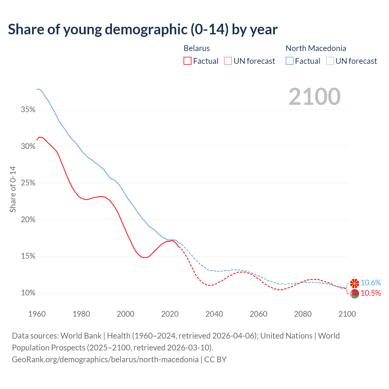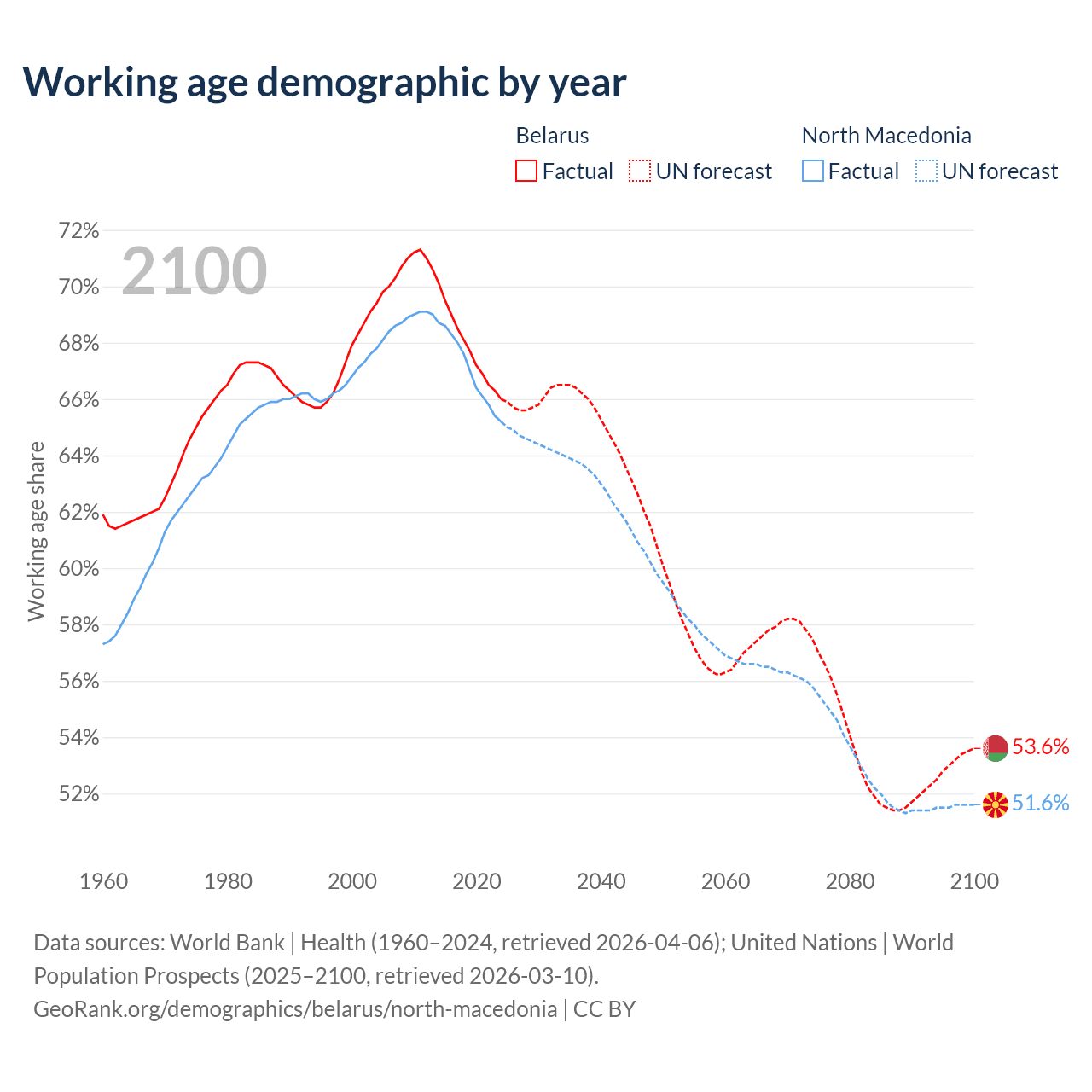 Median age Belarus vs North Macedonia, 1960-2100