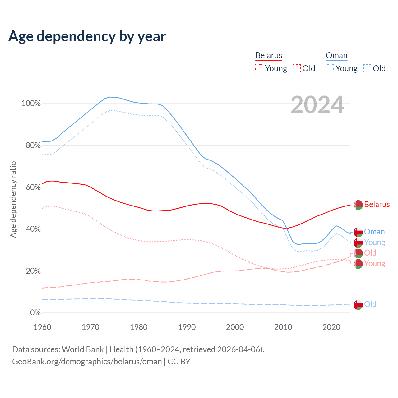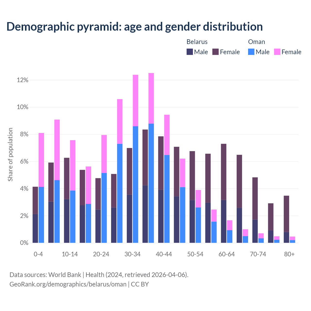 - Belarus is ranked 35/196 by median age (oldest to youngest) vs 101/196 for Oman.