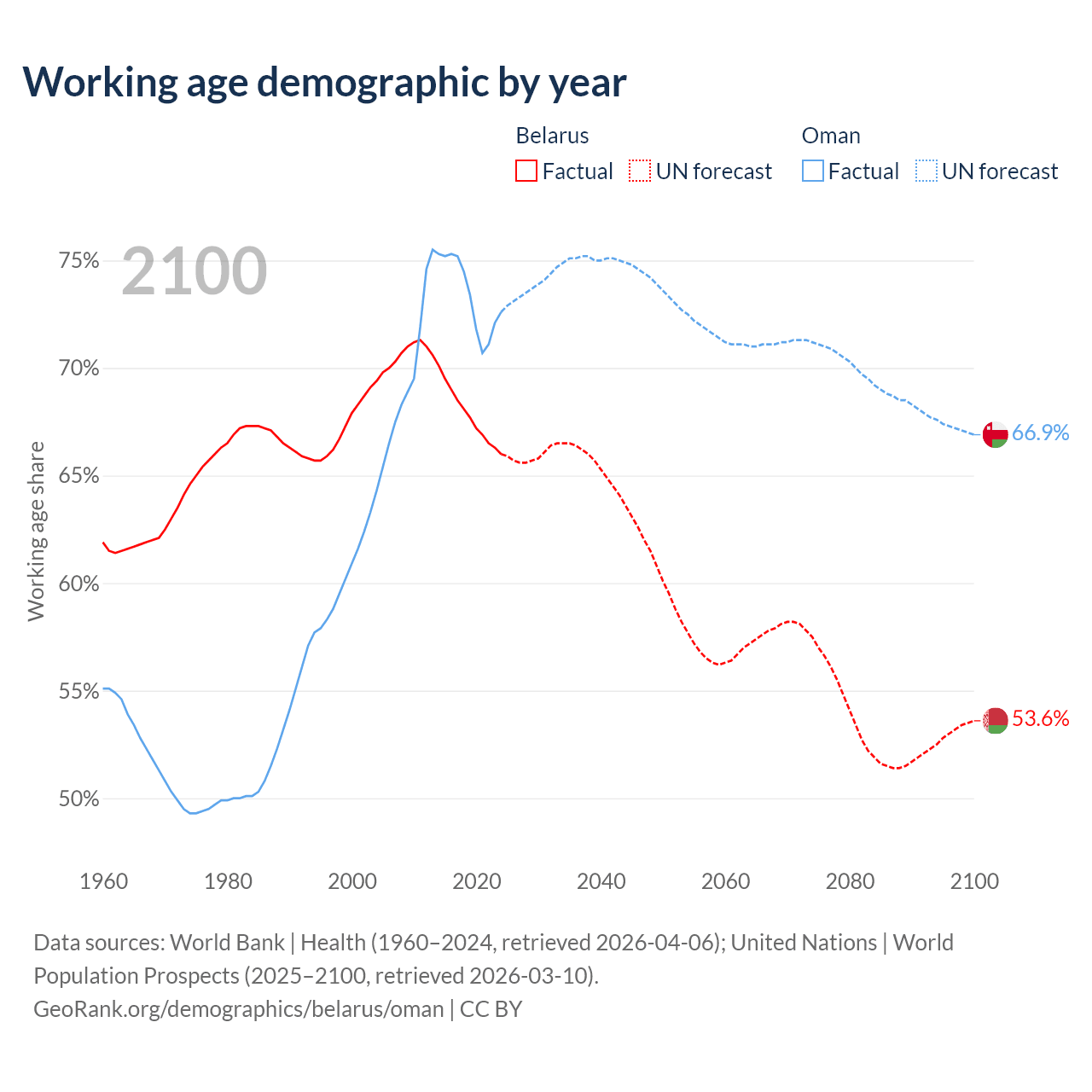 - Belarus has 5.95M working age adults (aged 15-64) vs 4.19M in Oman.