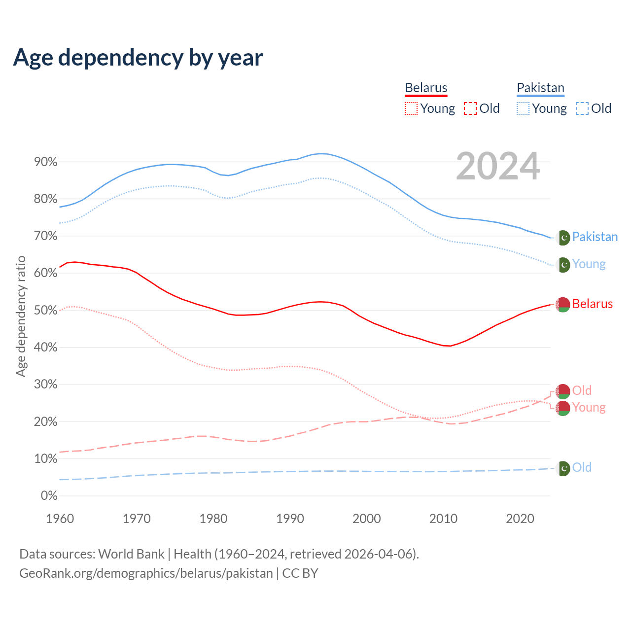 - Belarus is ranked 35/196 by median age (oldest to youngest) vs 154/196 for Pakistan.
