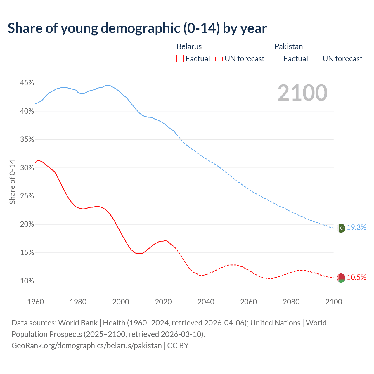 Median age Belarus vs Pakistan, 1960-2100