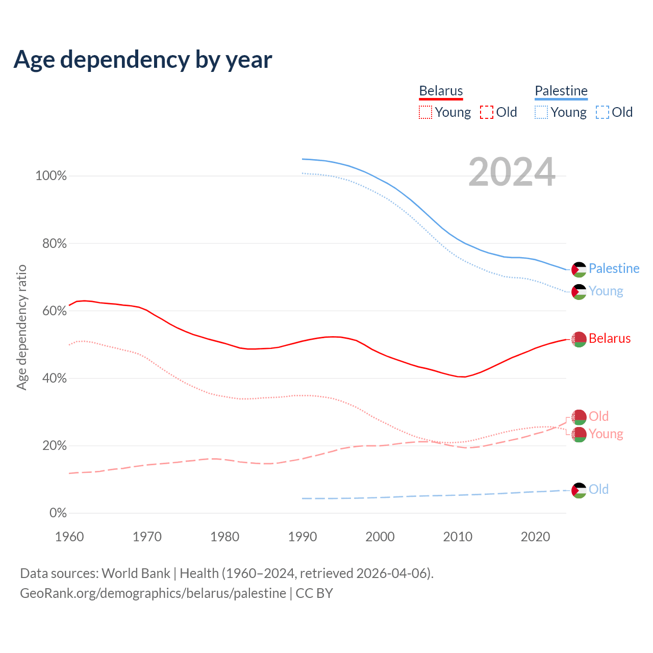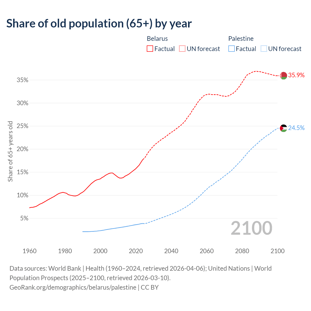 - The share of old-age demographic (65+) in Belarus is 17.7% vs 3.84% in Palestine.