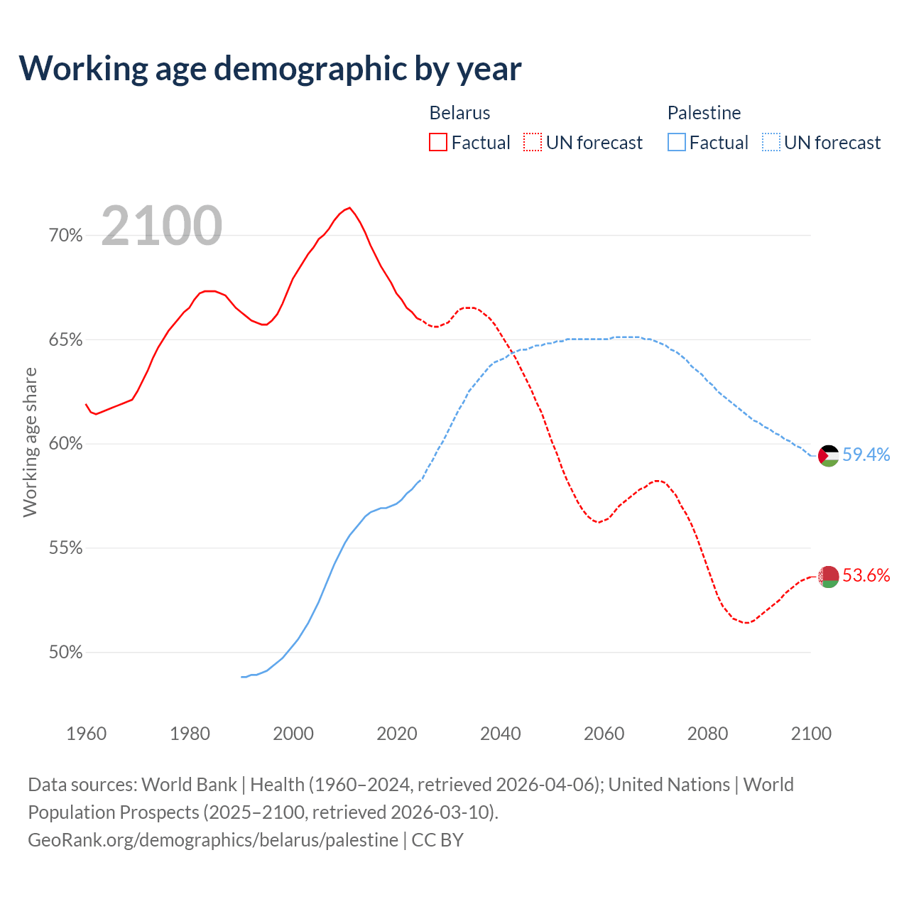 - Belarus has 5.95M working age adults (aged 15-64) vs 3.2M in Palestine.
