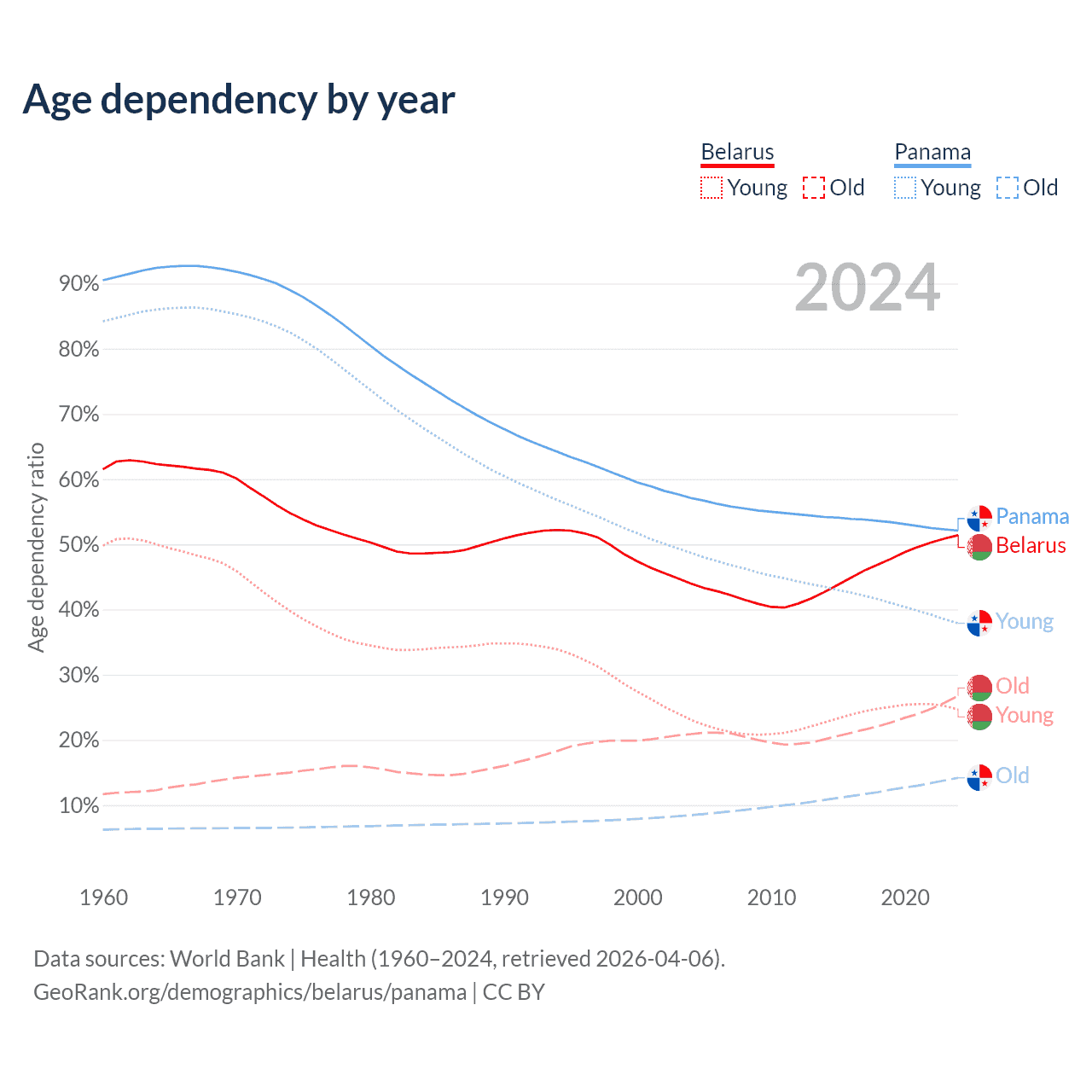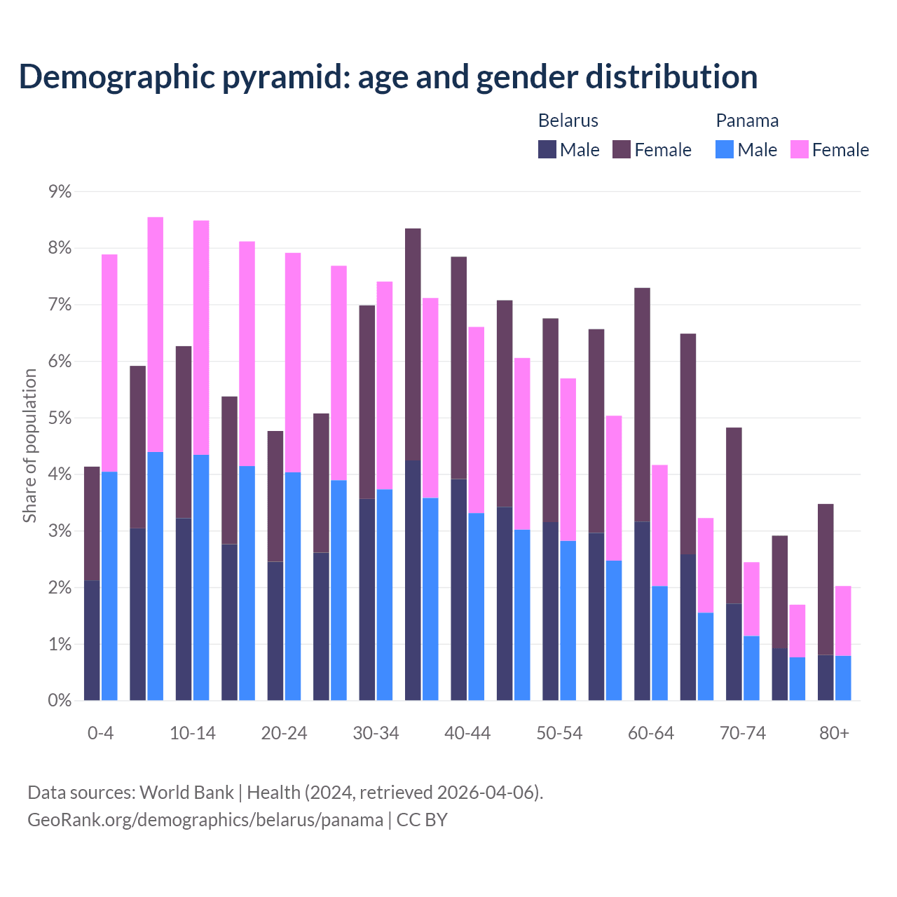 - Belarus is ranked 35/196 by median age (oldest to youngest) vs 94/196 for Panama.