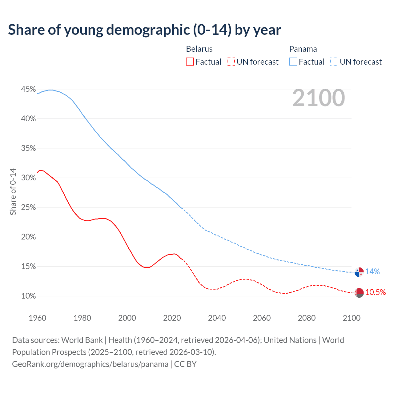 - The share of young demographic (0-15 years old) in Belarus is 16.3% vs 24.9% in Panama.