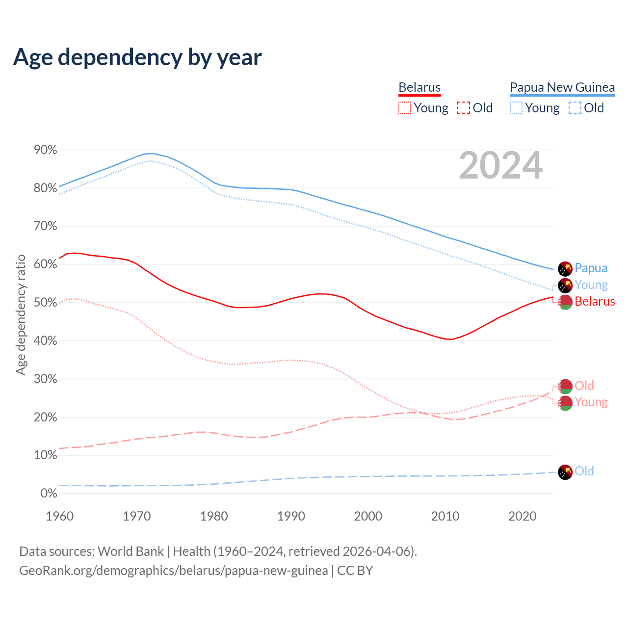 - Belarus is ranked 35/196 by median age (oldest to youngest) vs 140/196 for Papua New Guinea.