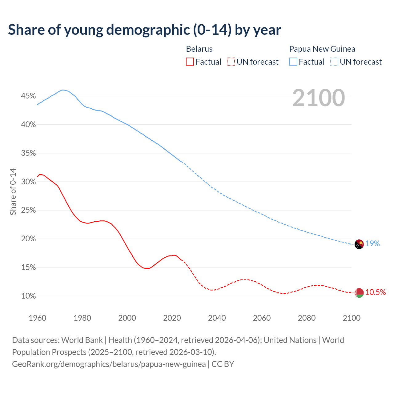 - The share of young demographic (0-15 years old) in Belarus is 16.3% vs 33.5% in Papua New Guinea.
