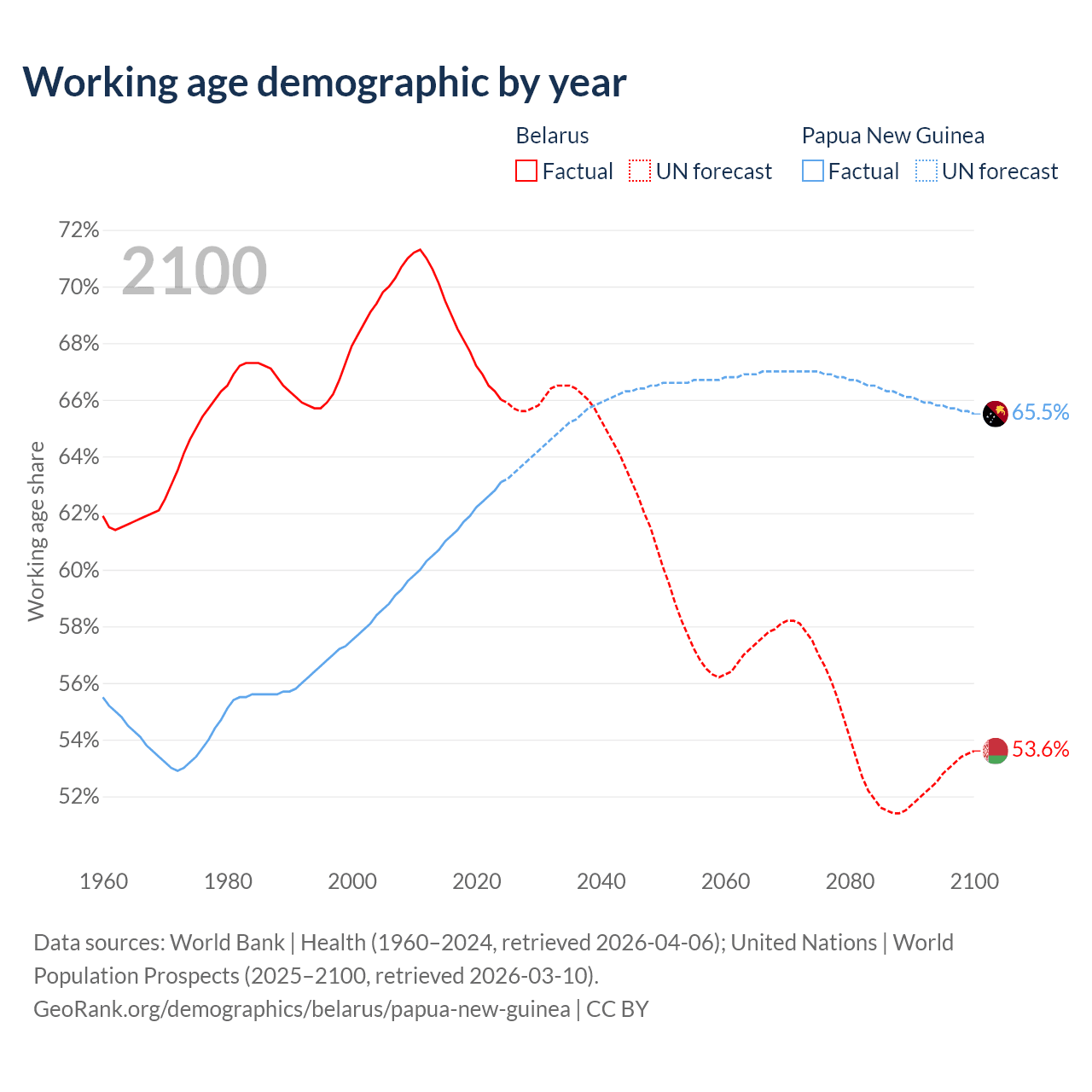 - Belarus has 5.95M working age adults (aged 15-64) vs 6.94M in Papua New Guinea.