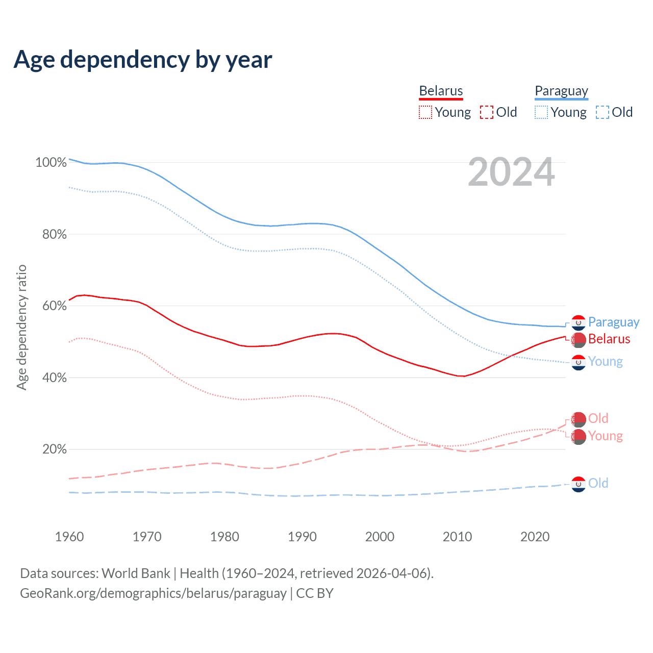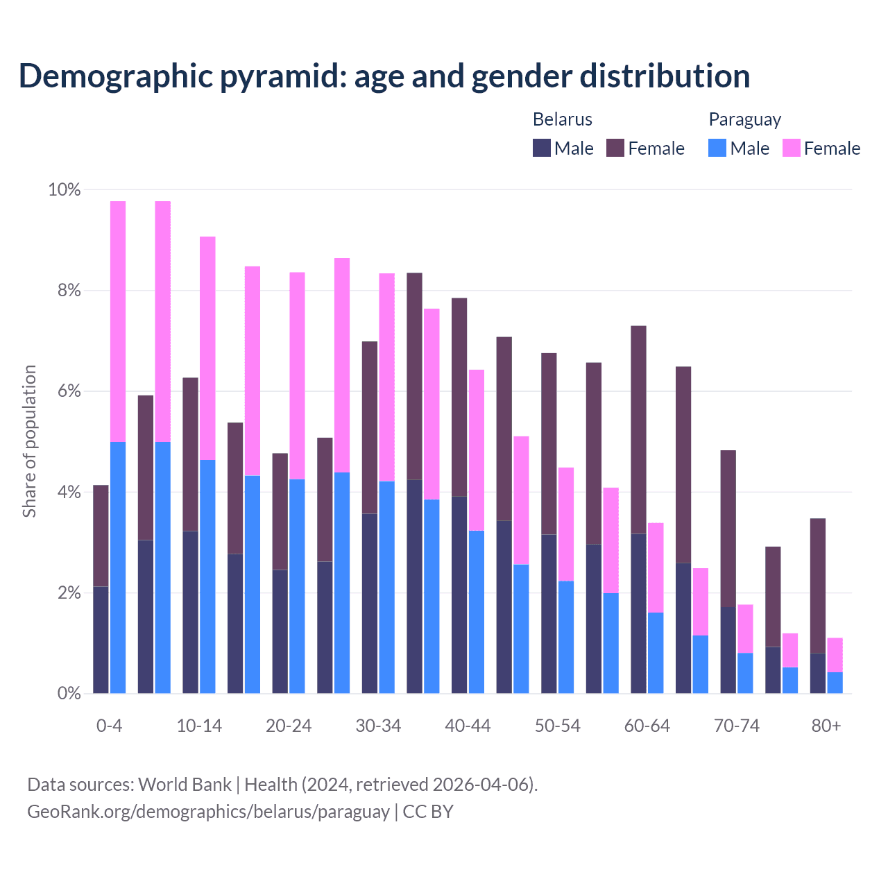 - Belarus is ranked 35/196 by median age (oldest to youngest) vs 118/196 for Paraguay.