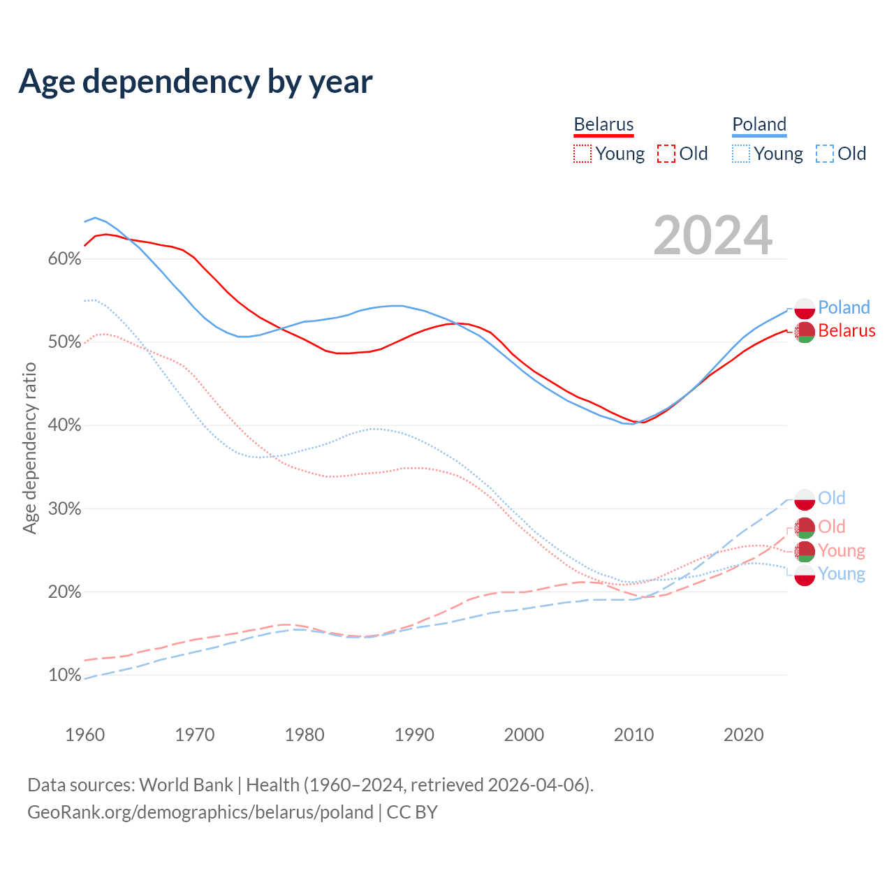 - Belarus is ranked 35/196 by median age (oldest to youngest) vs 30/196 for Poland.