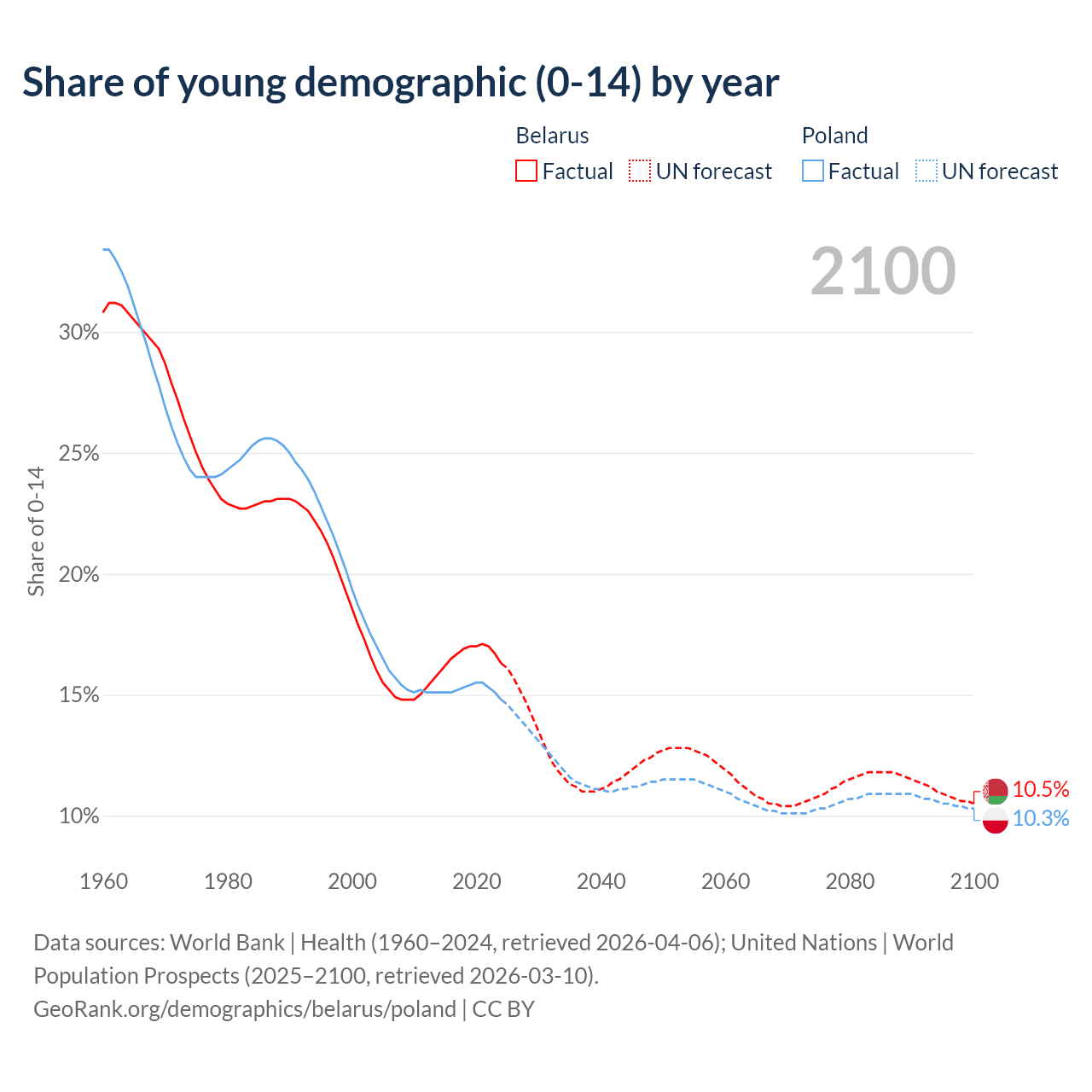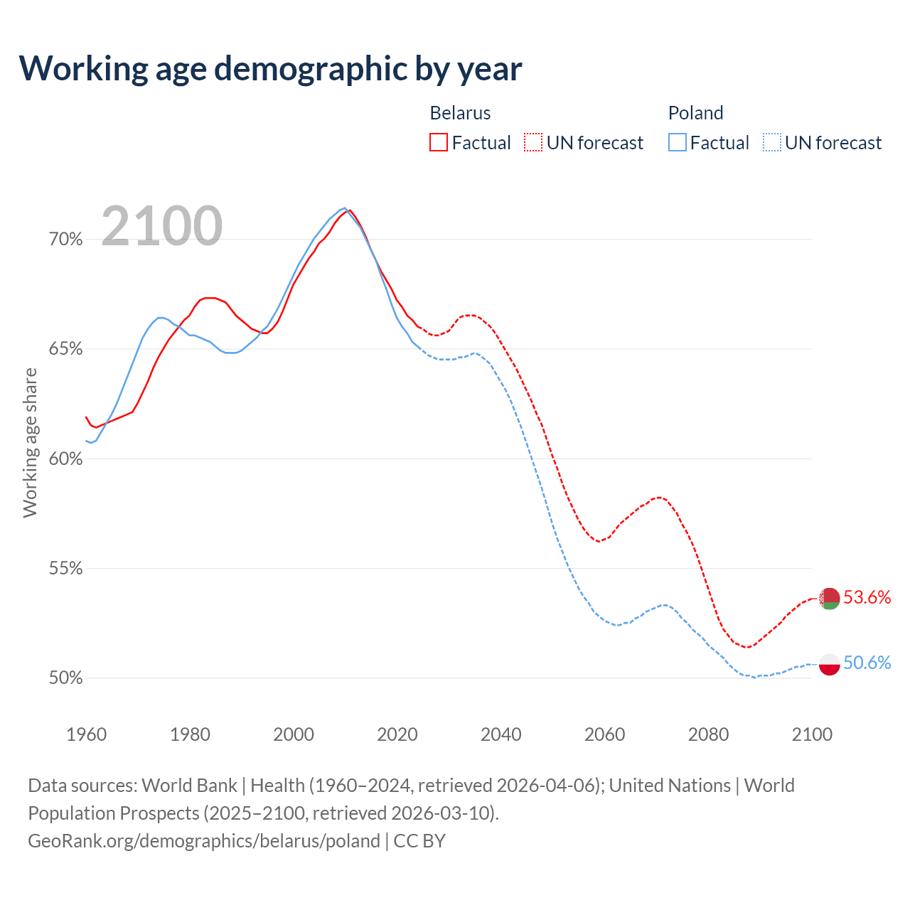 Median age Belarus vs Poland, 1960-2100