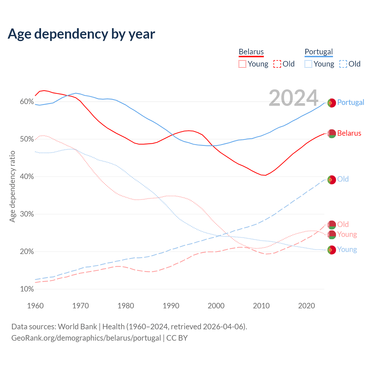 The share of older people aged 65 and over is 17.7% in Belarus and 24.5% in Portugal. Life expectancy in Belarus compared to Portugal .