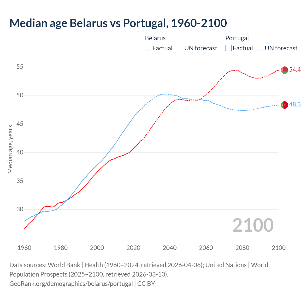 - The median age in Belarus is 42 years compared to 47.5 years in Portugal.