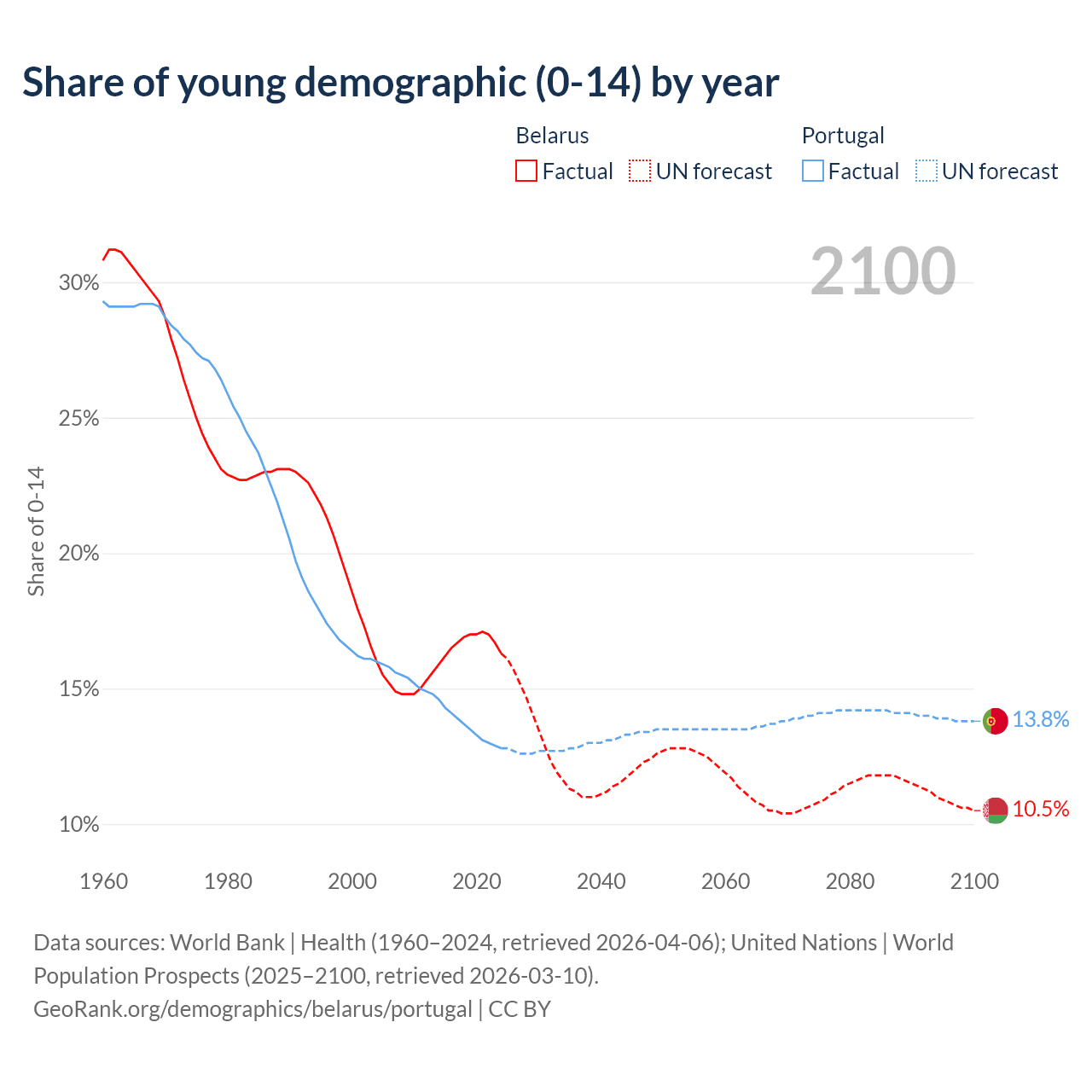- The share of young demographic (0-15 years old) in Belarus is 16.3% vs 12.8% in Portugal.