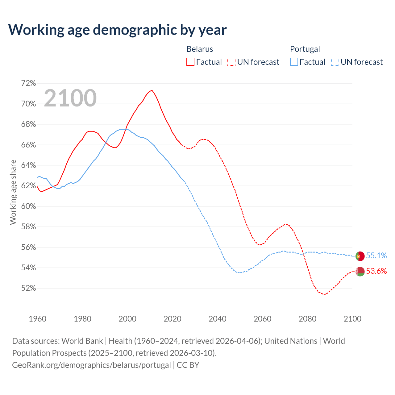 - Belarus has 5.95M working age adults (aged 15-64) vs 6.68M in Portugal.
