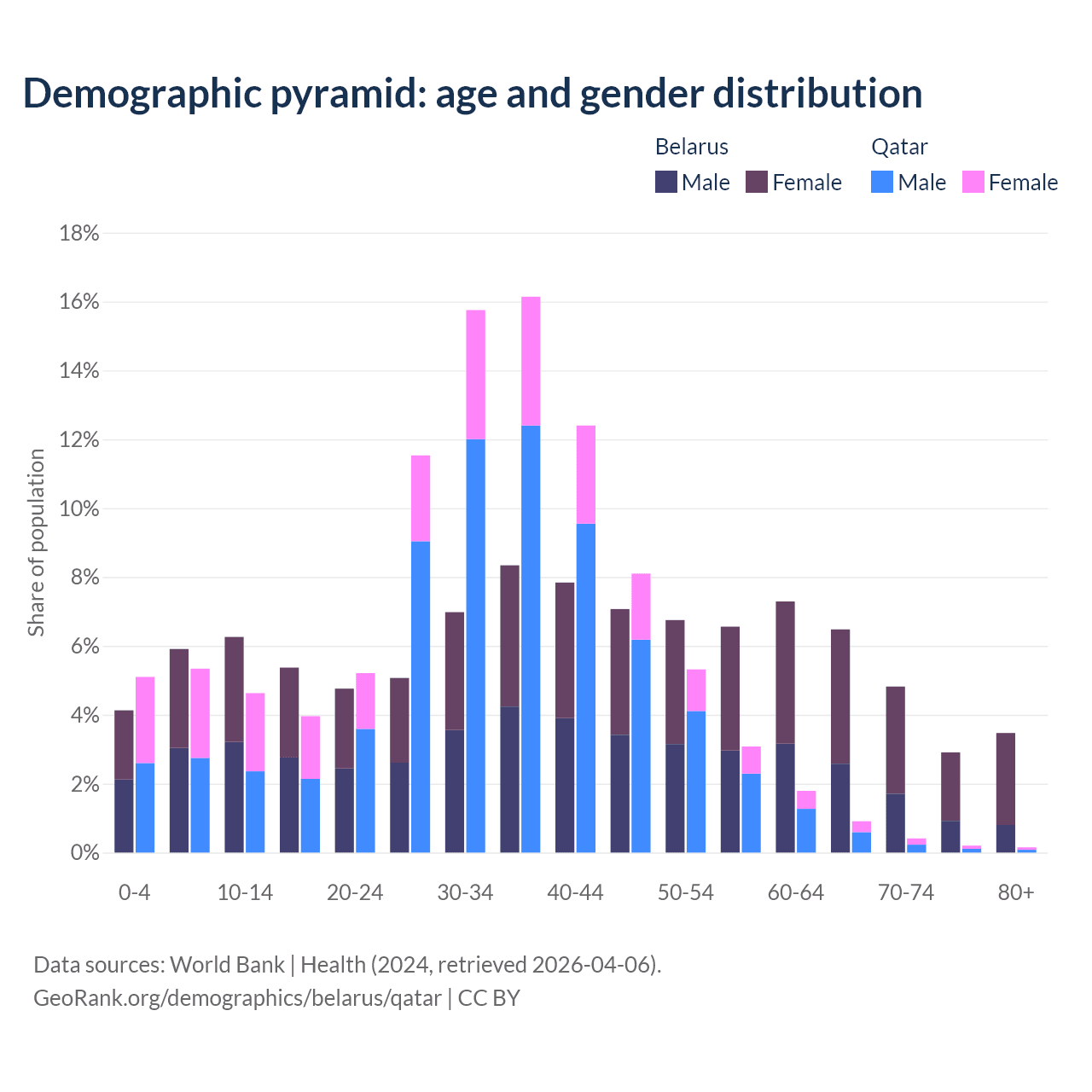- Belarus is ranked 35/196 by median age (oldest to youngest) vs 78/196 for Qatar.