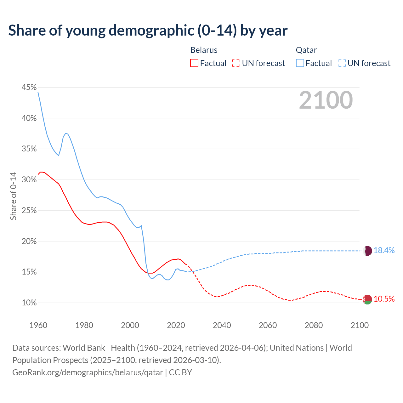 - The share of young demographic (0-15 years old) in Belarus is 16.3% vs 15.1% in Qatar.