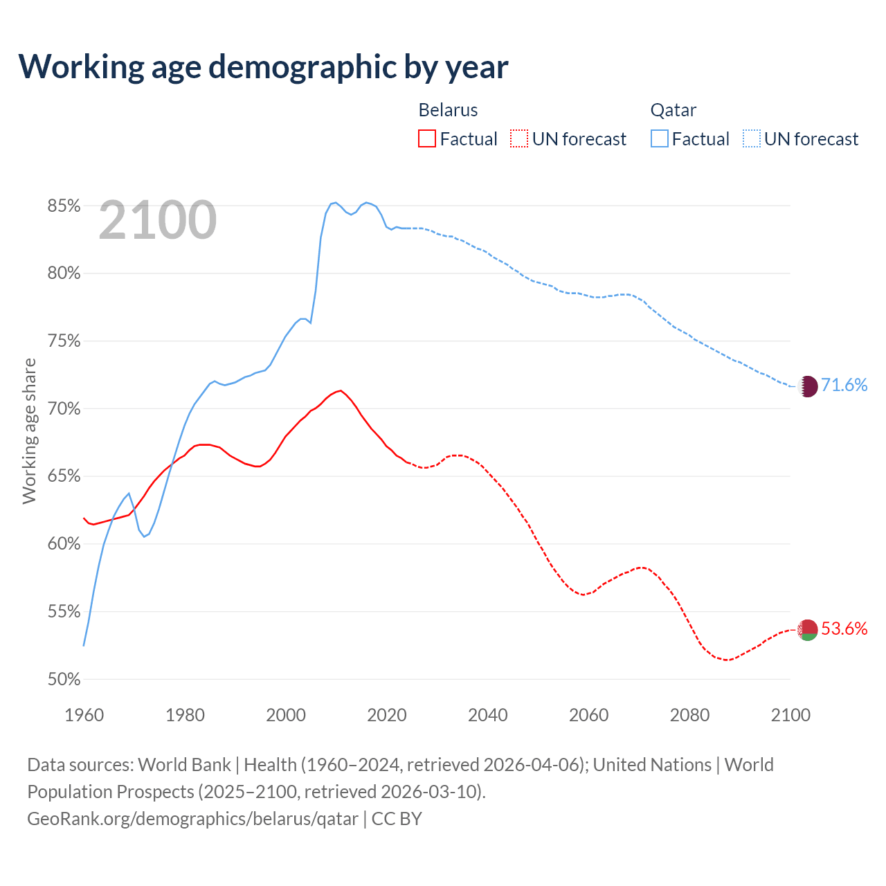 - Belarus has 5.95M working age adults (aged 15-64) vs 2.5M in Qatar.