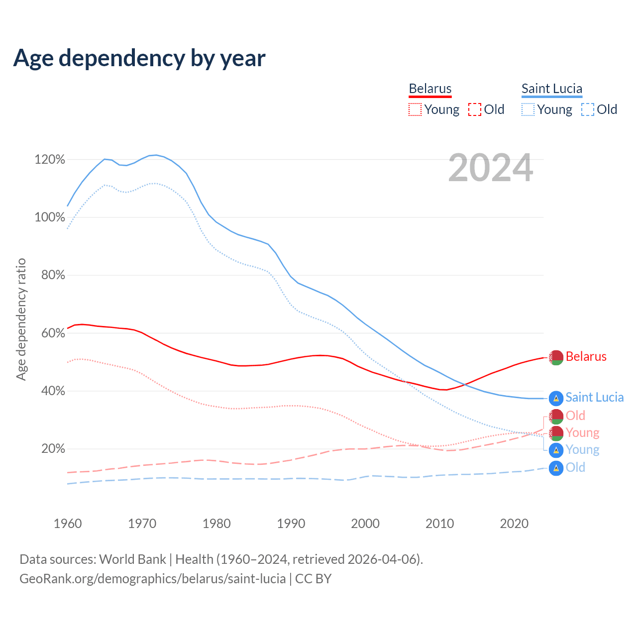 - The share of old-age demographic (65+) in Belarus is 17.7% vs 9.62% in Saint Lucia.