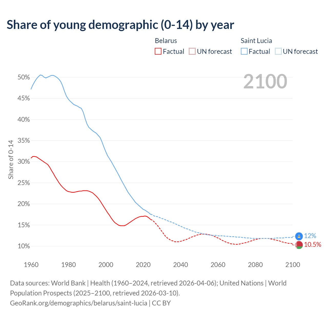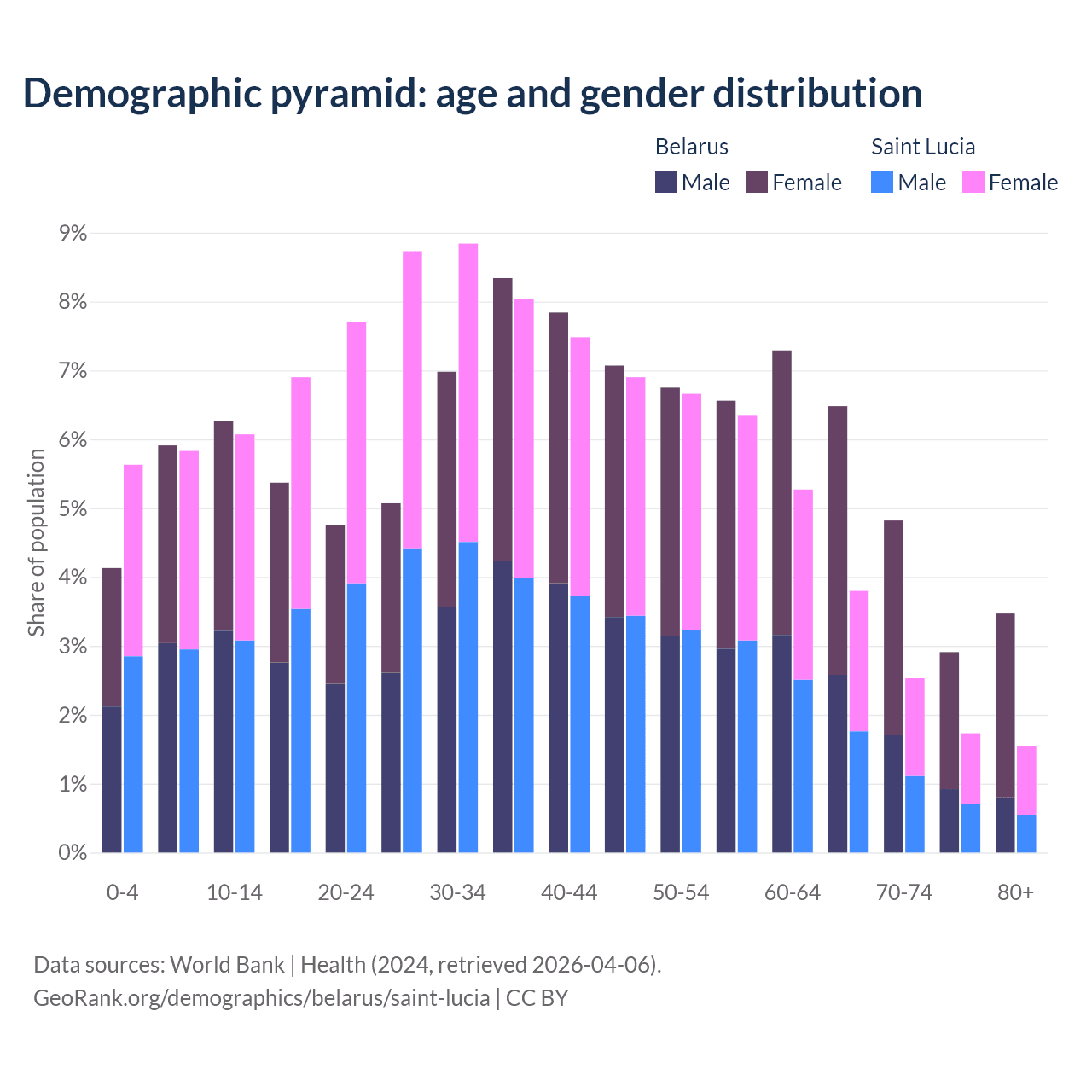 - The share of young demographic (0-15 years old) in Belarus is 16.3% vs 17.5% in Saint Lucia.