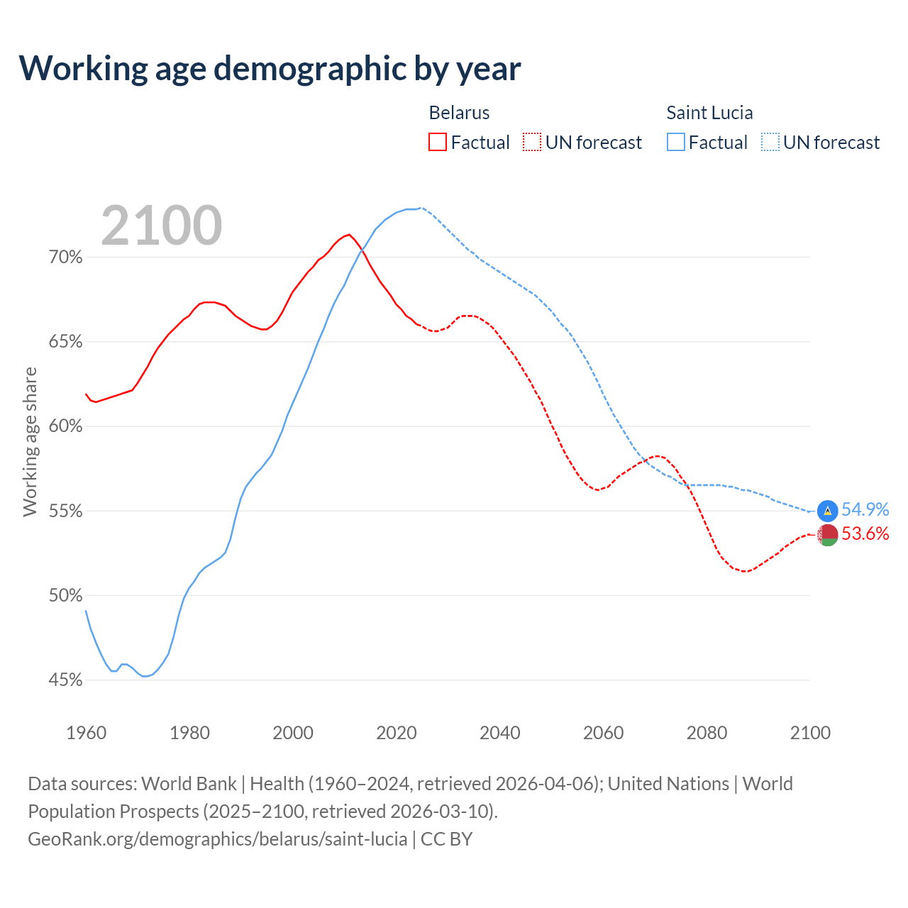 - Belarus has 5.95M working age adults (aged 15-64) vs 132K in Saint Lucia.
