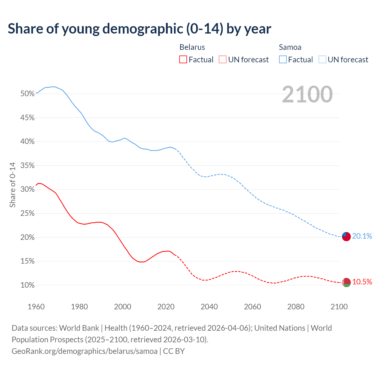 Median age Belarus vs Samoa, 1960-2100