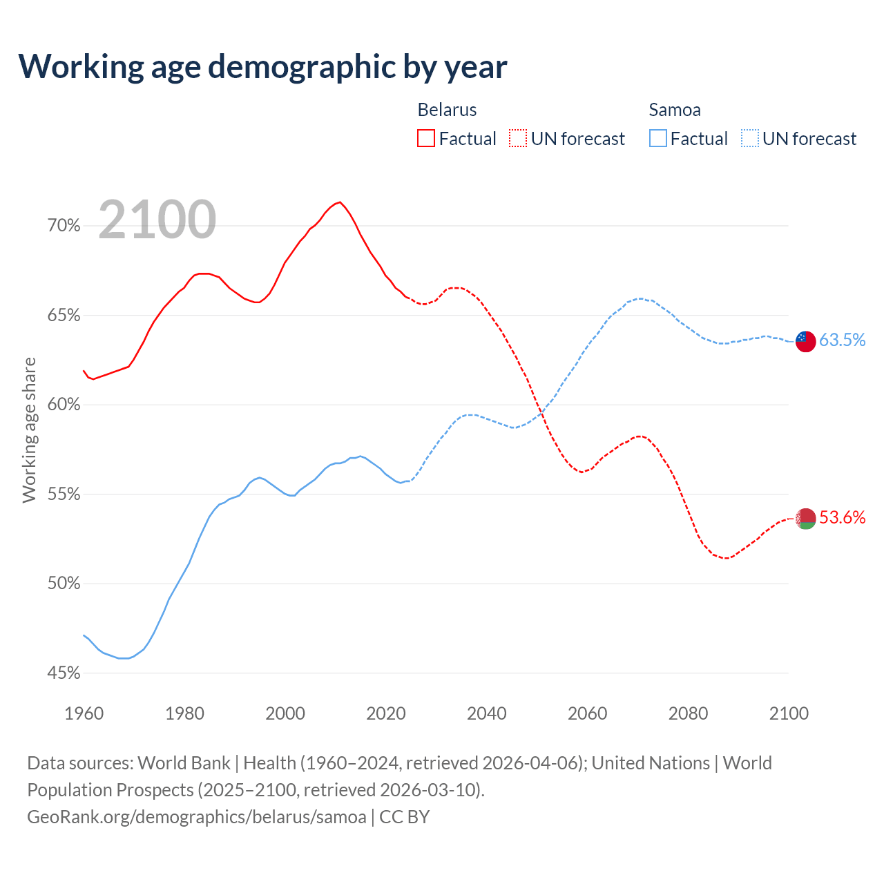- Belarus has 5.95M working age adults (aged 15-64) vs 123K in Samoa.