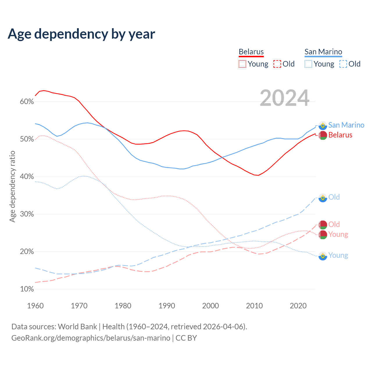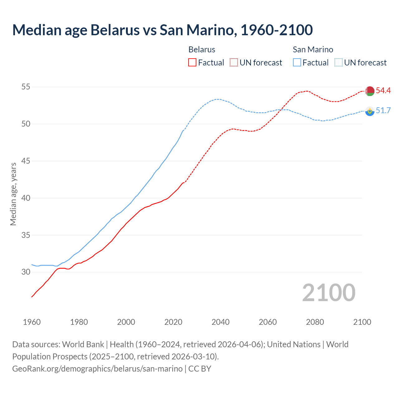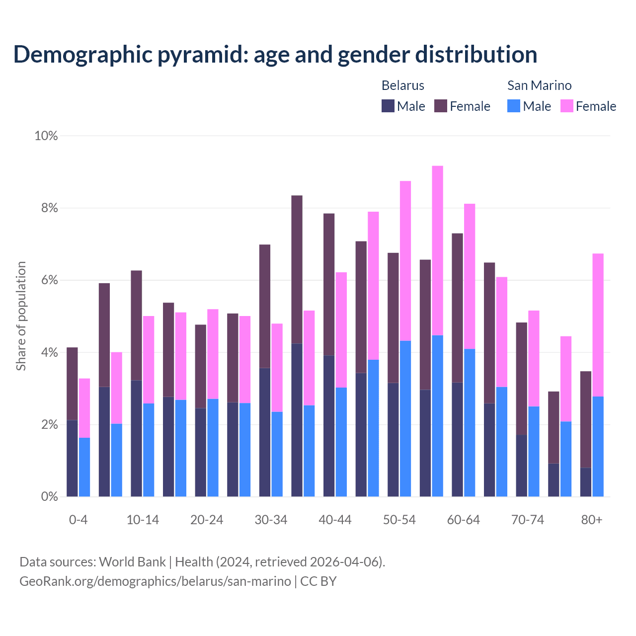 - Belarus is ranked 35/196 by median age (oldest to youngest) vs 3/196 for San Marino.