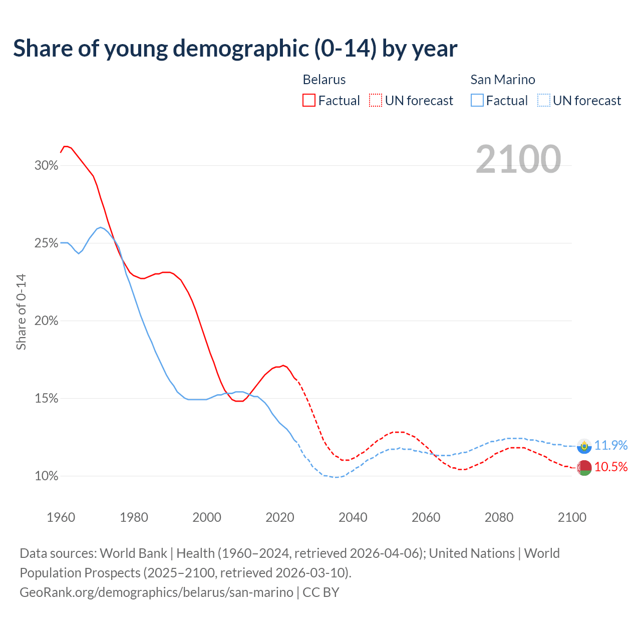 - The share of young demographic (0-15 years old) in Belarus is 16.3% vs 12.3% in San Marino.
