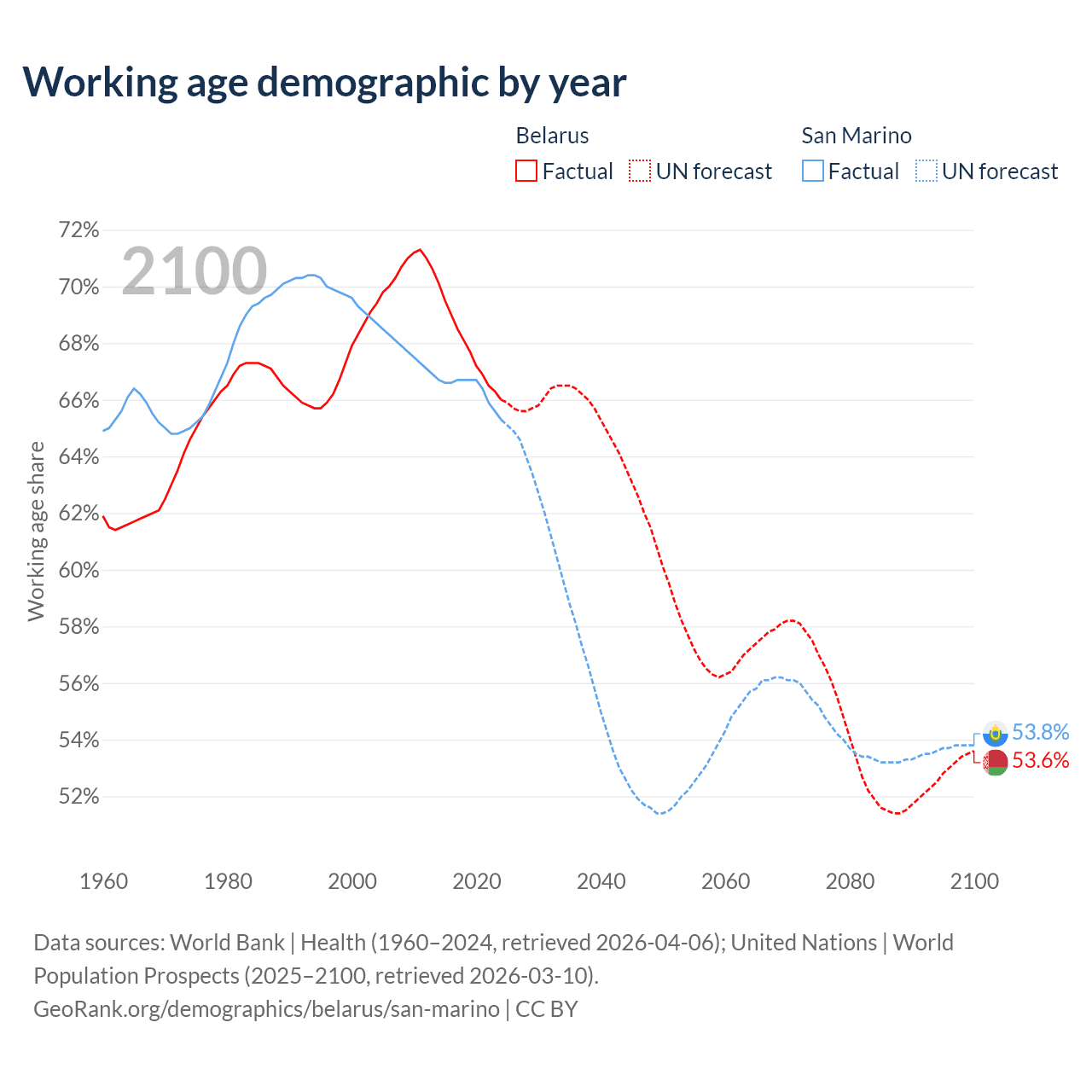 - Belarus has 5.95M working age adults (aged 15-64) vs 22.2K in San Marino.