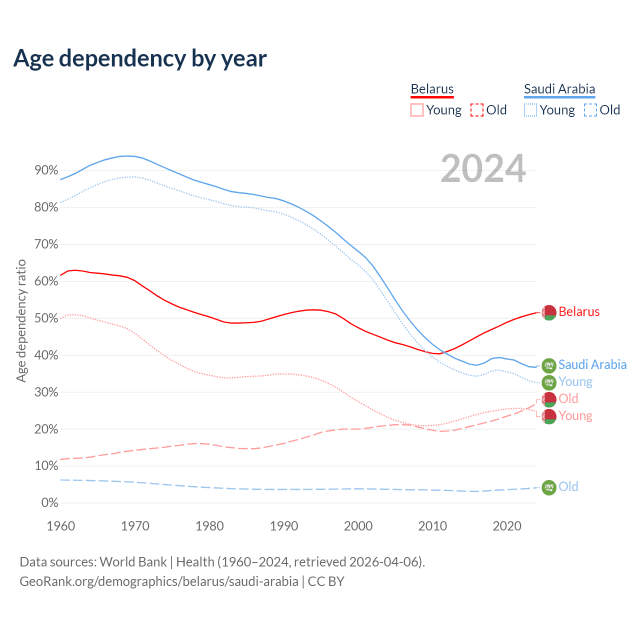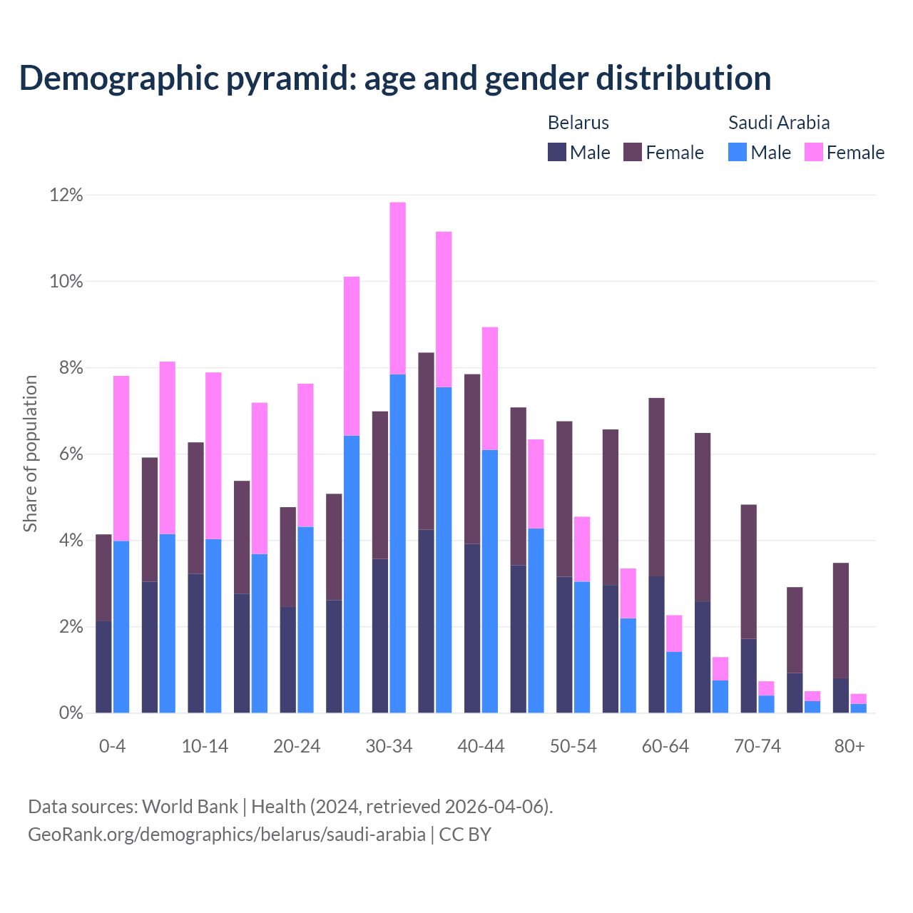 - Belarus is ranked 35/196 by median age (oldest to youngest) vs 98/196 for Saudi Arabia.