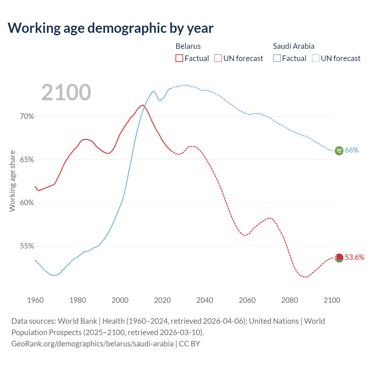 - Belarus has 5.95M working age adults (aged 15-64) vs 26.9M in Saudi Arabia.