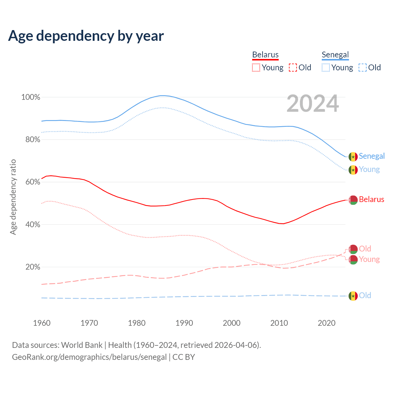 - Belarus is ranked 35/196 by median age (oldest to youngest) vs 162/196 for Senegal.