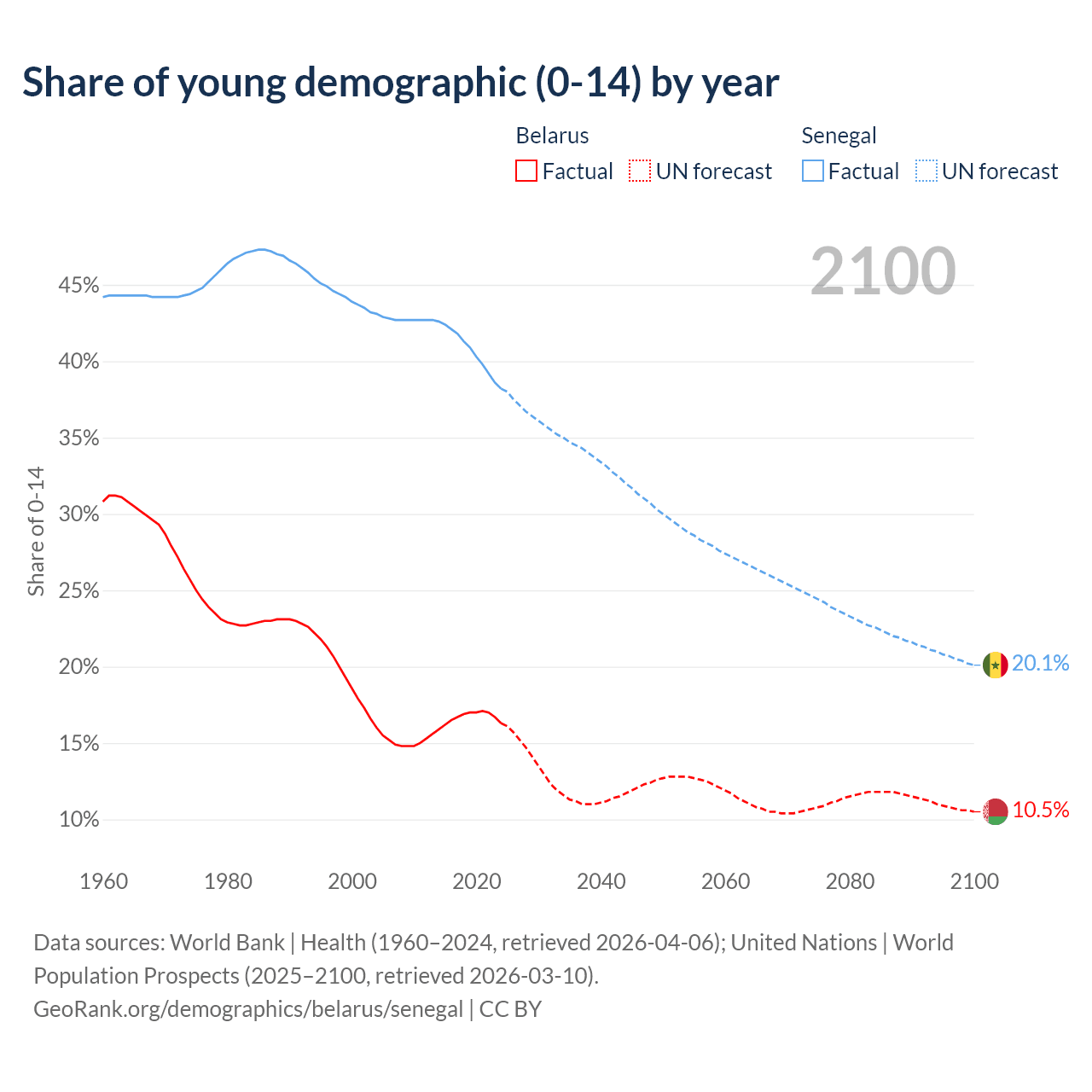 - The share of young demographic (0-15 years old) in Belarus is 16.3% vs 38.2% in Senegal.